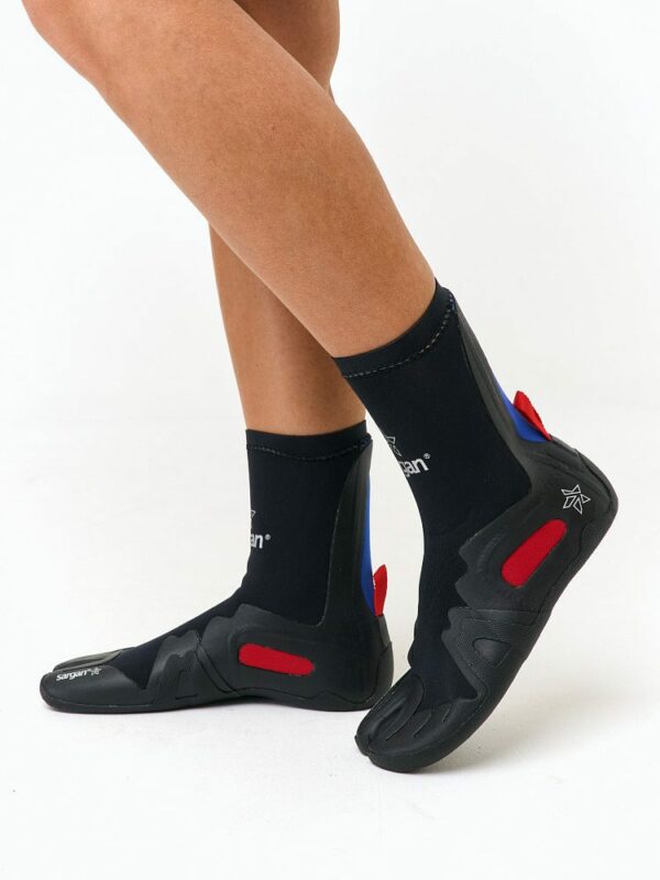 4840 ₽Кольцевой обтюратор (o-ring) вверху на входе в бот, раздельный большой палец (split-toe), тонкая резиновая подошва, сваренная вместе с боковыми усилениями, усилениями носка, пятки и вертикальным тонким резиновым усилением от пятки вверх. Внутри быстросохнущий материал. Черный неопрен/небольшие вставки синие-красные/яркая красная стропа-лямка для легкого одевания на пятке.