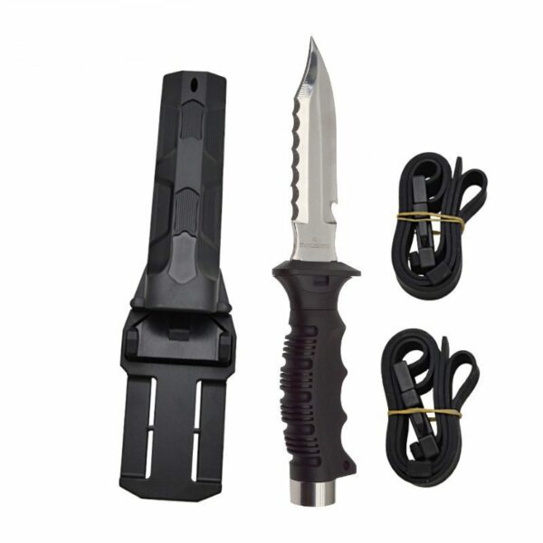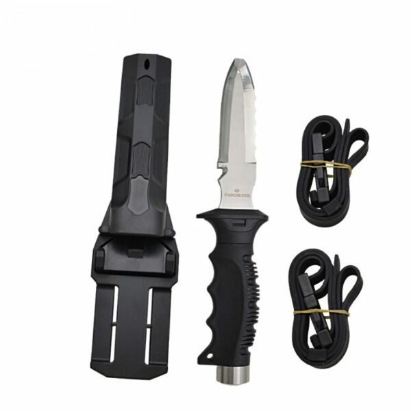 Нож водолазный, лезвие с острым концом Нож из нержавеющей стали, лезвие острое и обладает высокой твердостью. Оно специально разработано для экстренной перерезки различных канатов, веревок, линей и операций по выдергиванию/ распиливанию/ резке. Рукоятка ножа изготовлена из высококачественной резины и пластика вторичного литья под давлением, который обладает определенной гибкостью и удобен на ощупь. Рукоятка оснащена стальным молотком, который можно использовать для ударных операций Общая длина с ножнами 26,8см Лезвие:12,5 см острый конец / 11,5 см тупой конец Рукоятка 13 см Ширина 2,8 см в самом широком месте Материал нержавеющая сталь 420 Материал ручка — пластик Материал ножны — пластиковое цельное литье