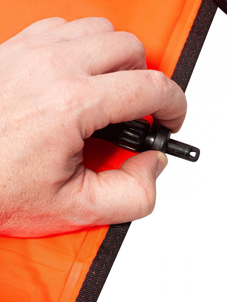 Надувной маркерный буй замкнутого цикла с запирающим клапаном предназначен для обозначения места-нахождения дайвера при прохождении декомпрессионных процедур, остановок безопасности, а так же для дайвинга в условиях сильного течения и плотного трафика судоходства.Маркер-буй может быть универсальным, аварийным средством поддержания плавучести на поверхности воды и подачи сигналов в экстренных ситуациях для привлечения помощи со стороны. Буй выполнен из прочной нейлоновой ткани с полиуретановым внутренним покрытием. Все швы прочно соединяются посредством ультразвуковой сварки и дополнительно усилены нейлоновыми лентами. В нижней части расположены нейлоновая петля и пластиковый карабин для крепления маркер-буя. Длинна буя 180 см, но в сложенном состоянии он очень компактен и может легко размещаться в карманах снаряжения или в кармане-накладке подвесной системы.