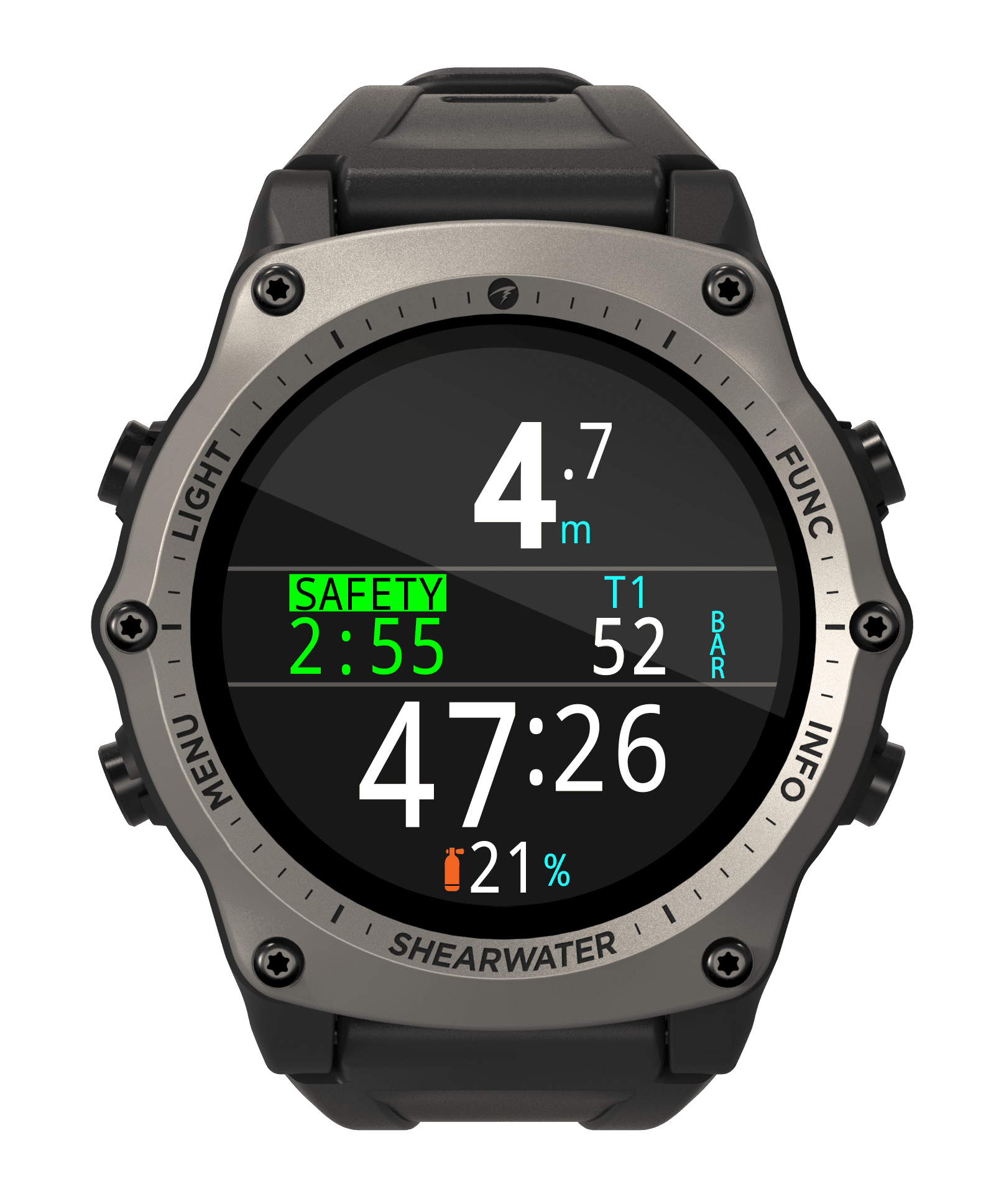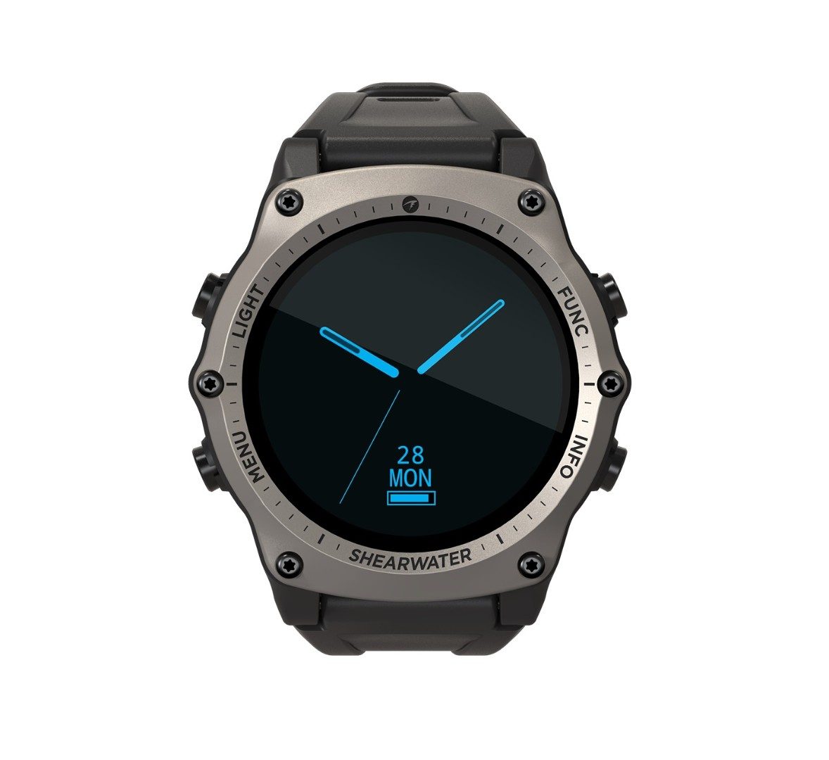 Подводный компьютер SHEARWATER TERIC.Первый SHEARWATER в формате часов! Полноценный технический компьютер в максимально компактном корпусе.Стильный для повседневной носки и надежный, современный прибор для погружений. Отличный подарок любому дайверу! Характеристики: Назначение: REC/TEC/CC-BO/боттом-таймер/фри-дайвинг Алгоритм: Булльман, адаптивный, 16 групп тканей Замена элемента питания: Не требуется Поддержка Nitrox: Да, до 100% О² в смеси Количество газов: 5 газов открытого цикла + 5 газов замкнутого Лог бук: 400 часов Максимальная глубина: 210 м Погрешность: 20 см Элемент питания: Встроенный Li-Ion аккумулятор Элемент питания трансмиттера: 3V CR2 Li Время работы: 50 часов в режиме dive. 3 мес в режиме ожидания Материал: Нержавеющая сталь (316)/сапфировое стекло Особенности: Первый SHEARWATER в формате часов! Полноценный технический компьютер в максимально компактном корпусе. Дисплей 400×400 AMOLED полноцветный. Диаметр: 1,39» Встроенный аккумулятор с запасом до 50 часов непрерывной работы. Беспроводная зарядка. Воздух. Найтрокс. Тримикс. Поддержка до двух трансмиттеров. Обновляемая прошивка. Декомпрессионная модель Buhlmann ZHL-16C c верхним и нижним градиент-факторами Опциональная декомпрессионная модель VPM-B Цифровой компас (3 оси, компенсация наклона) Возможность использования как штатного ремешка, так и «»венгерки»» (bungee-mount)
