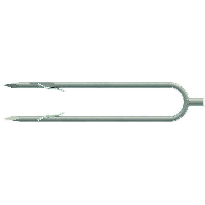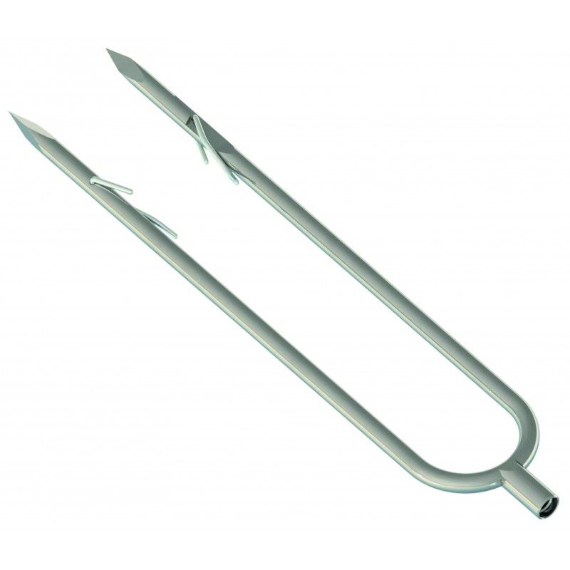 Двузубец «»Каюк»» изготавливается под резьбу международного стандарта М7. Диаметр зубов 7 мм. Глубина проникновения 230 мм. Расстояние от флажка до кончика зуба 35 мм. Расстояние по осям между крайними зубами 43 мм. Флажки выполнены из пружинной нержавеющей проволоки диаметром 2 мм. Остальные элементы изготовлены из упругой нержавеющей стали. Кончики зубов выполнены трехгранными и имеют большую проникающую способность по сравнению с круглыми. На фото положение флажков во время выстрела, удержания и снятия. Перед очередным заряжанием не забудьте вернуть флажки в исходное положение.Конструкция флажков патентована в России, Беларуси.