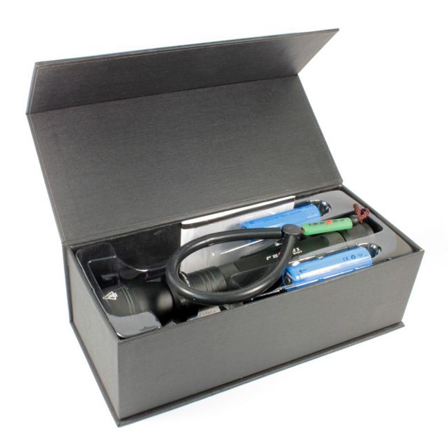 В комплект не входят аккумуляторы — 2шт, приобретаются отдельно назначение – погружение под воду; тип освещения: холодное белое и нейтральное белое; диод: Cree XM-L2; яркость освещения: 1000/930 люменов; цветовая температура: 3750-5000 Кельвинов; интенсивность светового потока: 21904/20592 кандела; дальнобойность: 296/287 метров; питание от батареек типоразмера 18650; погружение на глубину до 150 метров; защита от влаги и пыли по стандарту IPX8; 4 режима работы; включение и выключение поворотом магнитного переключателя; есть функция предупреждения о разряде батареи; ударопрочность – 1 метр; длина фонаря: 223 миллиметра; диаметр головной части – 40 миллиметров; диаметр корпуса – 27 миллиметров; весит 229,5 грамма.