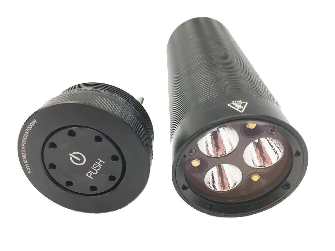 Фонарь подводный Ferei W155B (без аккумуляторов) оснащен 6-ю светодиодами с теплым свечением: три боковые — СREE XP-G и три центральные — СREE XP-L HI и обеспечивают световой пучок мощностью 3780 люмен. Имеет 3 режима яркости, герметичный корпус, защитный механизм от переполюсовки, систему контроля температуры, цифровую систему стабилизации уровня яркости свечения.