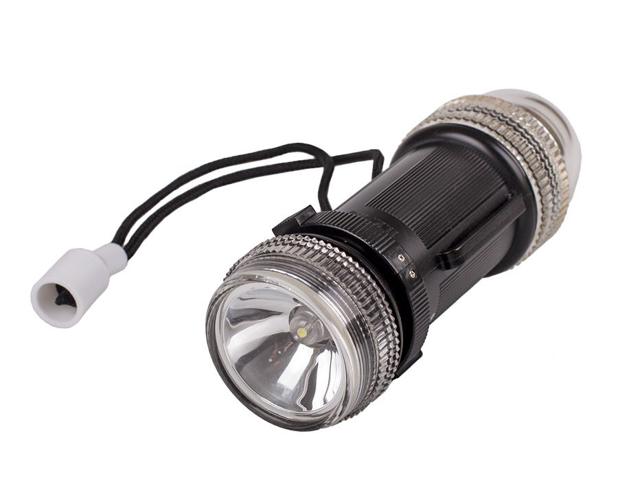 Новая версия фонаря AquaLung Combiflash. На разных сторонах расположены фонарь со светодиодом и специальная сигнальная лампа (проблесковый маячок) с мощным переменным (стробирующим) светом. Для крепления на запястье фонарь имеет регулируемый шнур. — источник питания: 2 АА — элемента- время горения: фонарь — 12 ч, маяк — 20 ч- вес на воздухе/ в воде: положительная плавучесть