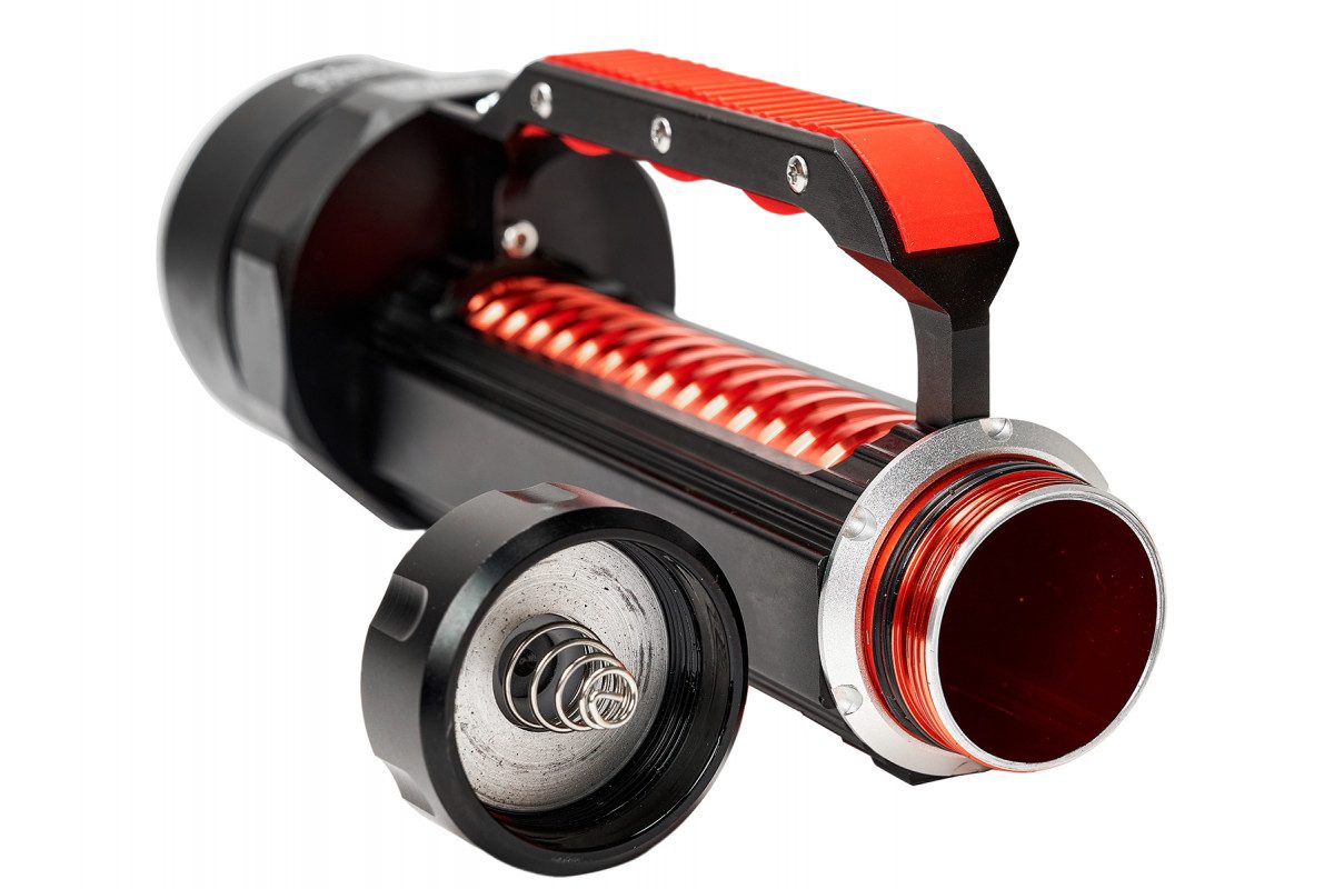 Фонарь подводный SCUBA BROTHERS BLASTER X6000, 5000 lm, желтый свет, это подводный фонарь c шестью диодами XHP70.2 (второе поколение) для охоты и дайвинга, который изготовлен из высокопрочного авиационного алюминия с анодированием. Фонарь оборудован новыми и надежными диодами XHP70.2 и магнитным переключателем (ползунком). На корпусе имеется удобная ручка для удержания фонаря, широкое пространство рукояти 30 мм позволяет держать фонарь даже в толстых перчатках. Фонарь SCUBA BROTHERS BLASTER X6000 предназначен для использования с аккумуляторами с типоразмером 26650, в количестве двух штук. Фонарь поставляется без аккумуляторов и зарядного устройства.