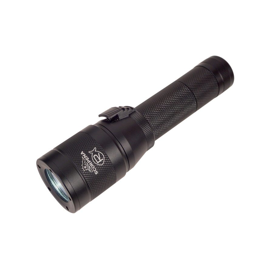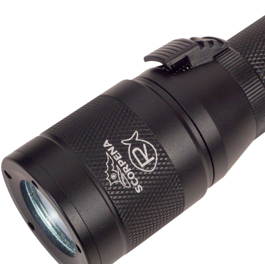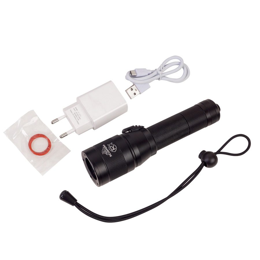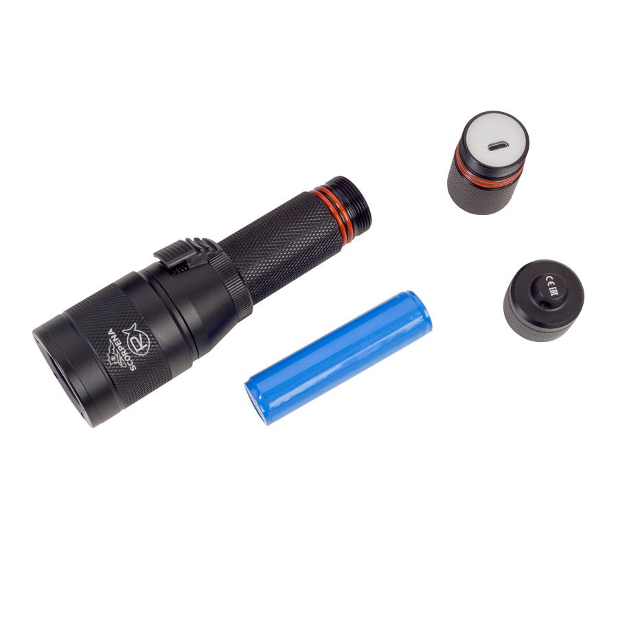 Фонарь Scorpena R может использоваться при любом типе подводной активности и даже при большинстве видов занятий на воде, например снорклинг, рафтинг, каякинг и пр. Этот фонарь имеет небольшой размеры: 16 см в длину, 4 см – диаметр головной части и 26.5 см – диаметр батарейного отсека. А весит он вместе со встроенным аккумулятором около 220 граммов (на суше). Фонарь Scorpena R укомплектован удобным эластичным шнуром для закрепления фонаря на запястье пловца. Фонарь Scorpena R имеет переключатель режимов работы весьма удобного типа — сдвижной, с последовательным изменением мощности светового потока: дежурный (пилотный) режим – 100 Lm и полный — 1000 Lm. Луч фонаря Scorpena R имеет практически равномерную засветку по всей площади и чётко очерченный край. Для приверженцев теории лучшей видимости света жёлтого спектра, в комплекте к каждому нашему фонарю мы приложили янтарно-жёлтый фильтр, который может быть легко наклеен самостоятельно в любое время. Главная особенность фонаря Scorpena R – возможность плавного изменения в широком диапазоне фокусировки (ширины) луча путём простого поворота головной части относительно корпуса и фиксацией в любом промежуточном положении. Питается фонарь Scorpena R от встроенной Li-Ion аккумуляторной батареи, время её работы от 3 часов — на максимальной мощности, до 30 часов – при дежурном (пилотном) режиме. Для подзарядки аккумулятора нет необходимости разбирать корпус и вынимать батарею из отсека – на фонаре Scorpena R можно открутить заднюю крышку и присоединить к зарядному гнезду широко распространённый кабель (со штекером MicroUSB)