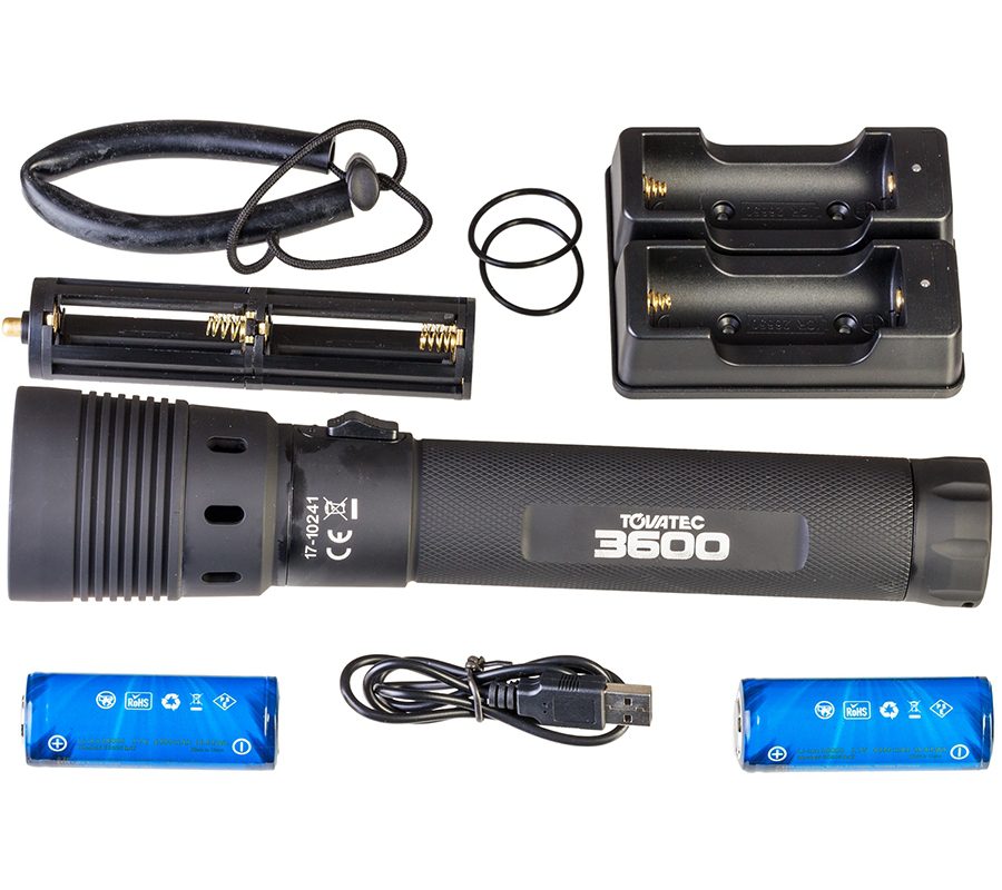 Самая яркая в линейке фонарей Tovatec, модель 3600 пришла на замену популярному фонарю Beacon. Обеспечивая регулируемый по ширине луч (от 12 до 100 градусов) яркостью до 3600 Люмен, этот фонарь прекрасно подходит для любых видов подводной деятельности. В комплекте: прочный кейс для хранения и перевозки, 2 аккумулятора 26650, кабель для зарядки, кассета для установки батареек и ремешок на руку. Светодиоды: CREE LED Яркость : 3600 Люмен Угол луча: Регулируемый 12˚ » 100˚ Цветовая температура: 5600-6800К Режимы: 100% • 50% • 10% • SOS Аккумулятор: 2х26650 Li-ion Время работы: 1,2 ч при 100% / 3 ч при 50% / 16 ч при 10% / 2 ч в режиме SOS Время зарядки : 6-7 ч Вместо аккумуляторов можно использовать 6 алкалиновых батареек АА Изготовлен из авиационного алюминия Магнитный кнопочный выключатель Рабочая глубина: 100 м Масса: 640 грамм (без аккумулятора) Габариты: 27,2 x 6 см