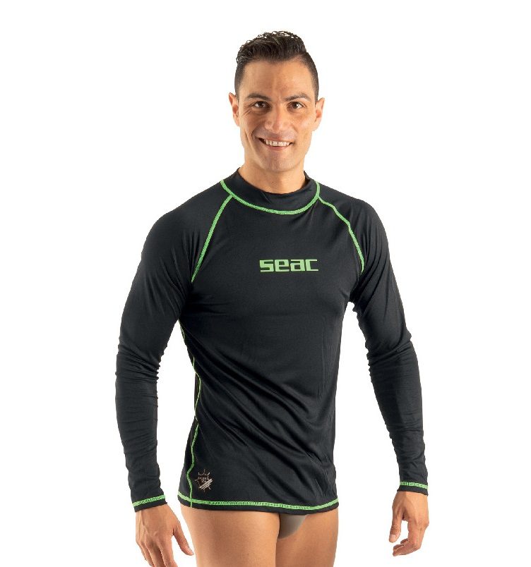 Рашгард SEAC SUB T-SUN MAN BLACK мужская нательная защитная майка – футболка – утеплитель с длинным рукавом, изготовленная из специального эластичного материала. Назначение: Защита от солнца, ветра и холода на воде и суше Используется: Для снорклинга (плавание с маской трубкой на воде и под водой) Активного плавания в море под солнцем Для всех водных и подводных видов спорта в теплой воде Отлично защищает от ультрафиолета (100%, UPF 50+)