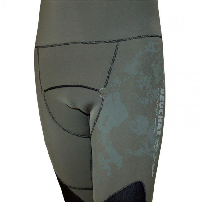 Описание Гидрокостюм для подводных охотников, который не хотят привлекать внимание к себе не только в воде, но и и на берегу. Костюм обеспечивает не только камуфляж, но и максимальный комфорт и тепло. Костюм из двух частей для интенсивной охоты и фридайвинга. Куртка с капюшоном толщиной 5 или 7 мм. Штаны с лямками “лонг джон” и возможностью укоротить их до уровня талии (5 или 7 мм) по заранее намеченным линиям отреза. Ультра-мягкий неопрен Elaskin X 8.8 увеличивает комфорт ношения и свободу движений. Внутри костюму – “открытая пора” для максимальной теплоизоляции. Крой:  Конструкция костюма разработана с учётом анатомических изгибов тела. Продуманный покрой предотвращает образование водных карманов на спине и между плечами. В штанах “лонг джон” используется более тонким материалом на лямках: 5 мм для 7 мм костюма и 3 мм для костюма толщиной 5 мм. Аналогично спроектирован капюшон куртки: 4 мм для 5 мм костюма и 6 мм для 7 мм костюма. На сгибах локтей и под коленями – детали из тисненого материала для облегчения движений в суставах. На внешней стороне коленей и локтей – максимально тянущиеся панели. Костюм плотно облегает облегает нижнюю часть тела, уменьшает трение и  натяжения материала в седле штанов. Застёжка – двойная клипса. Капюшон с системой Anti-Squeeze в области ушной раковины обработан изнутри тканью, что упрощает компенсацию давления в ушах во время погружений.  Разработка Braca Concept:  Braca Concept – эксклюзивная разработка Beuchat, которая предлагает простое и гигиеничное решение проблемы выведения лишней жидкости из организма охотника, не снимая костюм. Braca Concept – система обтюрации на штанах костюма, которая остается незаметной и не пропускает воду внутрь. Система Precut System:  Система Precut System предусматривает возможность обрезать лямки штанов «long john» если необходимо, и переделать их в штаны с высокой талией. Специальное тиснение по неопрену обозначает линию отреза на нужном уровне, при этом внутренний шов стыка деталей обработан специальными накладками, чтобы при срезе лямок шов оставался сохранным. Камуфляж Magic Camo:  Натуральный цвет камуфляжа проявляется только в воде после намокания. На суше костюм не привлекает к себе лишнего внимания. Камуфляж нанесен зонально, чтобы еще больше разбить силуэт охотника под водой и сделать его незаметным. Усиления и отделка:  Удлиненные защитные детали из эластичного Supratex 2 на локтевых частях и коленях, нагрудная накладка для удобства заряжания длинных и мощных ружей препятствует проскальзыванию ружья. Лицевой обтюратор выполнен из более тонкого неопрена (на 1 мм тоньше основной толщины костюма) для комфорта про носке и лучшего прилегания к поверхности кожи лица. Детали костюма состыкованы край-в-край и обработаны оверлоком. Края отделаны эластичным кантом для обеспечения лучшей водонепроницаемости, укрепляет края и придает костюму законченный совершенный облик.