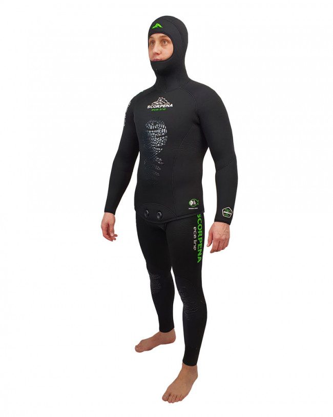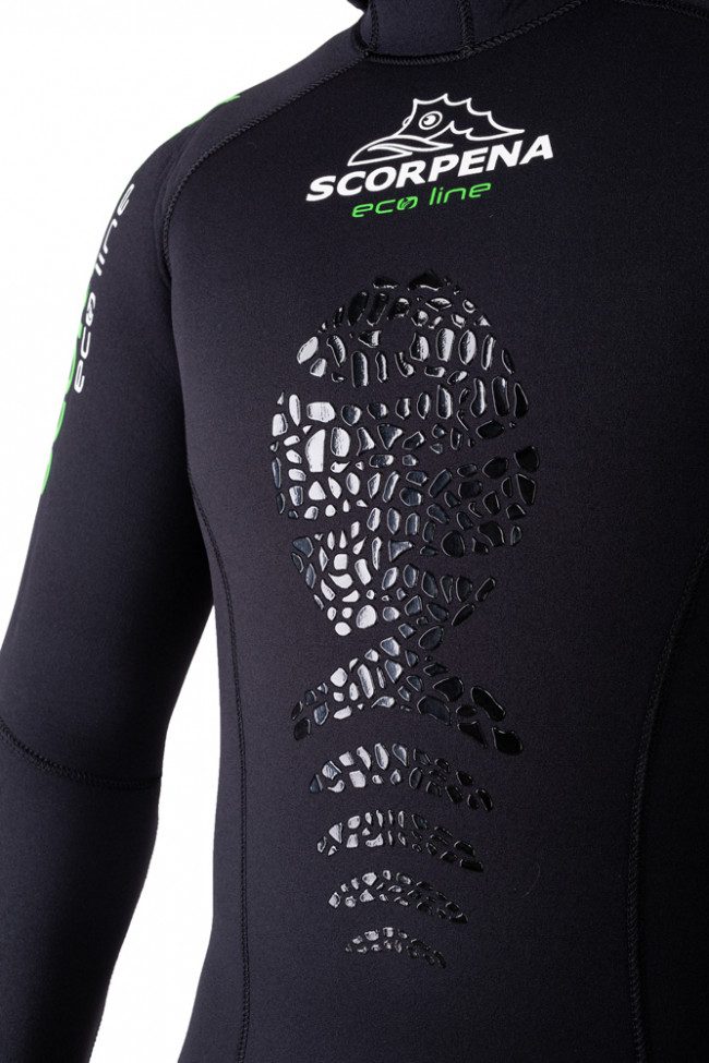 Scorpena EcoLine — то, чего у нас ещё не было! Совсем новый гидрокостюм. Что в нём уникального? Всё, от дизайна и материалов до технологии производства! Девизом этой модели можно назвать фразу: «»Просто скажи «да» экологически чистому неопрену»».Этот гидрокостюм создан из неопрена Sheico с использованием натурального сырья, некоторых вторичных материалов и применения экологических технологий. Мы любим окружающую среду, в которой мы живем, и пришло время внести свой вклад в её сохранение. Вот почему мы начинаем производство этих гидрокостюмов Scorpena. Причём по весьма демократичной цене. EcoLine — гидрокостюм, который производится по новой (для нас) экологичной технологии, на 30% эта модель состоит из сырья вторичной переработки. Несмотря на новизну и экологичность производства, этот костюм будет входить в относительно бюджетный сегмент нашей коллекции гидрокостюмов. Как мы уже говорили, эта модель будет производиться как в варианте с двойным нейлоновым покрытием (внутри и снаружи), так и с открытой порой внутри.  Модели костюмов с открытой порой изнутри мы рекомендуем для тех подводных охотников, кто охотятся подолгу и которые чувствуют уверенность в своём опыте обращения с неопреновыми изделиями и знаниями об уходе за ними. А костюмы с нейлоновым покрытием изнутри предназначены для охотников которые не проводят по 5-6 часов под водой и те, кому приходится одеваться в морозную погоду или на пронизывающем ветру или облачаться сразу в лодке. Гидрокостюм SCORPENA EcoLine состоит из двух частей: комбинезона типа Long John (Лонг Джон) представляющего собой высокие штаны с лямками, а также куртки со встроенным шлемом. Выкройка гидрокостюма Scorpena EcoLine анатомическая, скроена по фигуре, с учетом анатомии российских охотников и состоит из 29 деталей. Все швы проклеены встык на автоматическом оборудовании компании Sheico и дополнительно прошиты мягким и тянущимся слепым швом нитками с повышенной устойчивостью к гниению. Кромки куртки и штанов обшиты по периметру лайкровой лентой, а рукава и штанины обработаны тянущимся швом «»оверлок»» для предотвращения отслаивания ткани от неопреновой пены. Особая наша гордость – анатомический встроенный шлем который садится как влитой на подавляющее большинство российских подводных охотников и максимально закрывает голову и шею. Широкий лицевой круговой обтюратор капюшона выполнен из гладкого неопрена изнутри, что не позволяет воде просачиваться внутрь и увеличивает комфорт использования. Манжеты на штанинах и лицевая манжета костюма Scorpena EcoLine выполнены чуть более тонкими для большей эластичности и имеет изнутри гладкое покрытие Glideskin для предотвращения проникновения воды под костюм. Застежка куртки – двойная клипса на нижнем запАхе типа «»бобровый хвост»». Кстати, этот запах усилен нейлоном с обоих сторон, чтобы уменьшить вероятность повреждения при снятии костюма. Колени Scorpena EcoLine дополнительно усилены износостойкой тканью типа Supratex. А поверх этого материала в области колен нанесено особое матовое покрытие в виде сложного рисунка, что делает костюм не только удобным в использовании, но и стильным внешне. Также высокий стиль костюма подчёркивает полиуретановый глянцевый рисунок в виде стилизованной фирменной рыбки на груди, который предотвращает проскальзывание упора ружья при заряжании, но при этом не стесн
