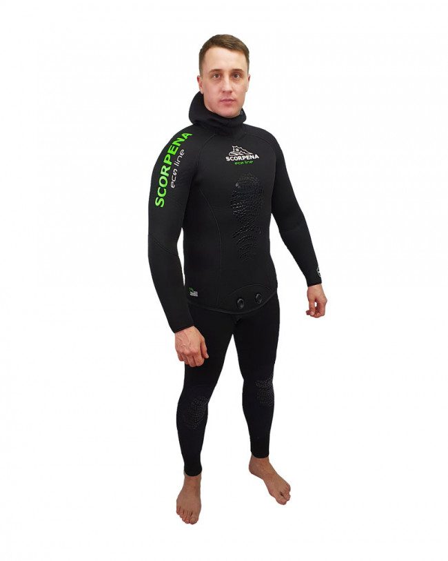 Scorpena EcoLine — то, чего у нас ещё не было! Совсем новый гидрокостюм. Что в нём уникального? Всё, от дизайна и материалов до технологии производства! Девизом этой модели можно назвать фразу: «»Просто скажи «да» экологически чистому неопрену»».Этот гидрокостюм создан из неопрена Sheico с использованием натурального сырья, некоторых вторичных материалов и применения экологических технологий. Мы любим окружающую среду, в которой мы живем, и пришло время внести свой вклад в её сохранение. Вот почему мы начинаем производство этих гидрокостюмов Scorpena. Причём по весьма демократичной цене. EcoLine — гидрокостюм, который производится по новой (для нас) экологичной технологии, на 30% эта модель состоит из сырья вторичной переработки. Несмотря на новизну и экологичность производства, этот костюм будет входить в относительно бюджетный сегмент нашей коллекции гидрокостюмов. Как мы уже говорили, эта модель будет производиться как в варианте с двойным нейлоновым покрытием (внутри и снаружи), так и с открытой порой внутри. Модели костюмов с открытой порой изнутри мы рекомендуем для тех подводных охотников, кто охотятся подолгу и которые чувствуют уверенность в своём опыте обращения с неопреновыми изделиями и знаниями об уходе за ними. А костюмы с нейлоновым покрытием изнутри предназначены для охотников которые не проводят по 5-6 часов под водой и те, кому приходится одеваться в морозную погоду или на пронизывающем ветру или облачаться сразу в лодке. Гидрокостюм SCORPENA EcoLine состоит из двух частей: комбинезона типа Long John (Лонг Джон) представляющего собой высокие штаны с лямками, а также куртки со встроенным шлемом. Выкройка гидрокостюма Scorpena EcoLine анатомическая, скроена по фигуре, с учетом анатомии российских охотников и состоит из 29 деталей. Все швы проклеены встык на автоматическом оборудовании компании Sheico и дополнительно прошиты мягким и тянущимся слепым швом нитками с повышенной устойчивостью к гниению. Кромки куртки и штанов обшиты по периметру лайкровой лентой, а рукава и штанины обработаны тянущимся швом «»оверлок»» для предотвращения отслаивания ткани от неопреновой пены. Особая наша гордость – анатомический встроенный шлем который садится как влитой на подавляющее большинство российских подводных охотников и максимально закрывает голову и шею. Широкий лицевой круговой обтюратор капюшона выполнен из гладкого неопрена изнутри, что не позволяет воде просачиваться внутрь и увеличивает комфорт использования. Манжеты на штанинах и лицевая манжета костюма Scorpena EcoLine выполнены чуть более тонкими для большей эластичности и имеет изнутри гладкое покрытие Glideskin для предотвращения проникновения воды под костюм. Застежка куртки – двойная клипса на нижнем запАхе типа «»бобровый хвост»». Кстати, этот запах усилен нейлоном с обоих сторон, чтобы уменьшить вероятность повреждения при снятии костюма. Колени Scorpena EcoLine дополнительно усилены износостойкой тканью типа Supratex. А поверх этого материала в области колен нанесено особое матовое покрытие в виде сложного рисунка, что делает костюм не только удобным в использовании, но и стильным внешне. Также высокий стиль костюма подчёркивает полиуретановый глянцевый рисунок в виде стилизованной фирменной рыбки на груди, который предотвращает проскальзывание упора ружья при заряжании, но при этом не стесня