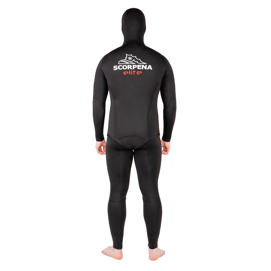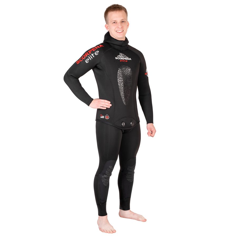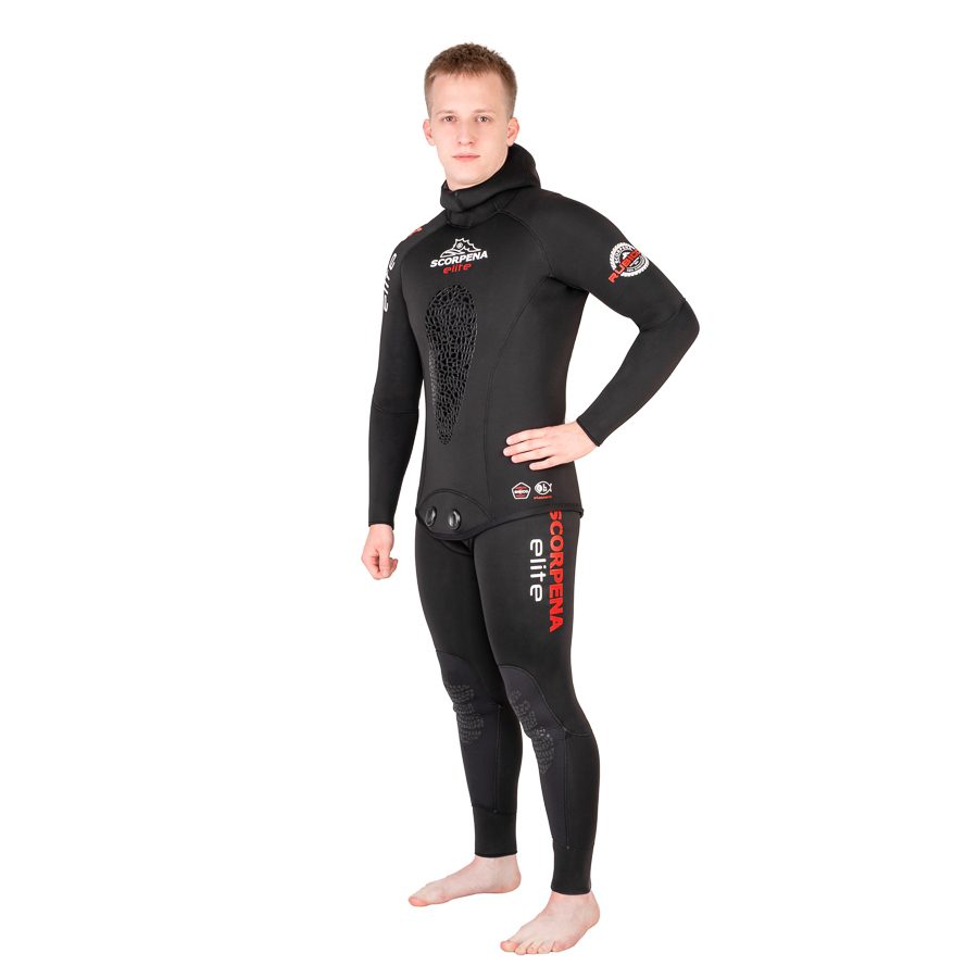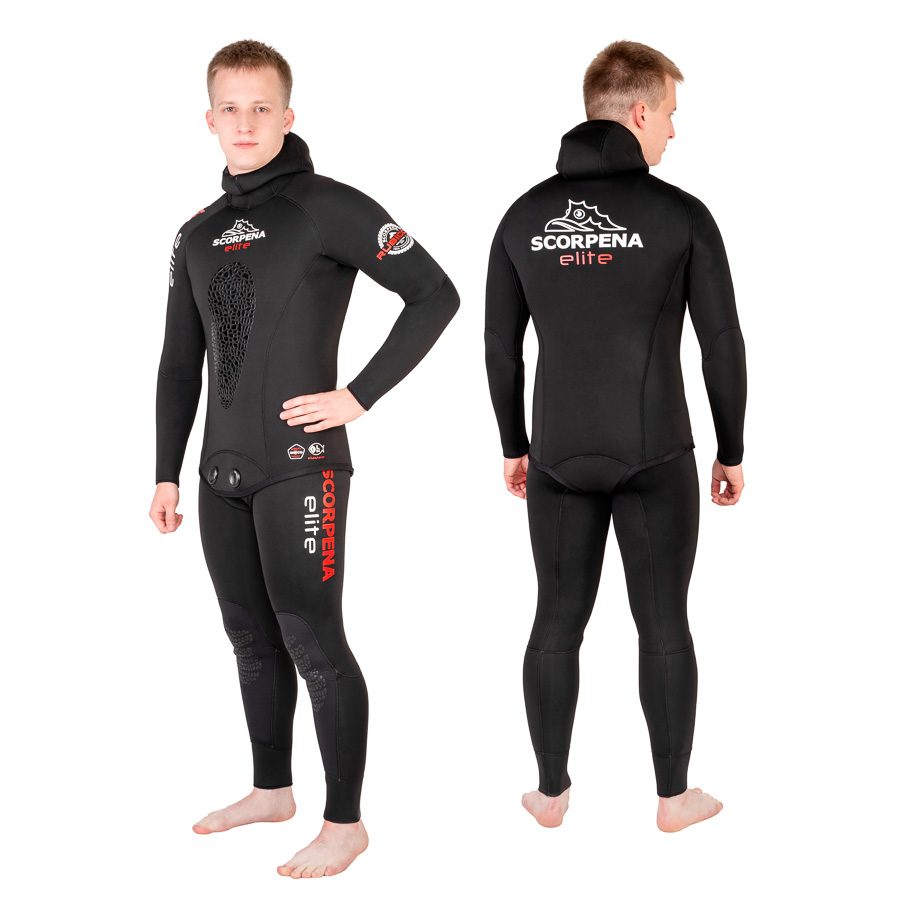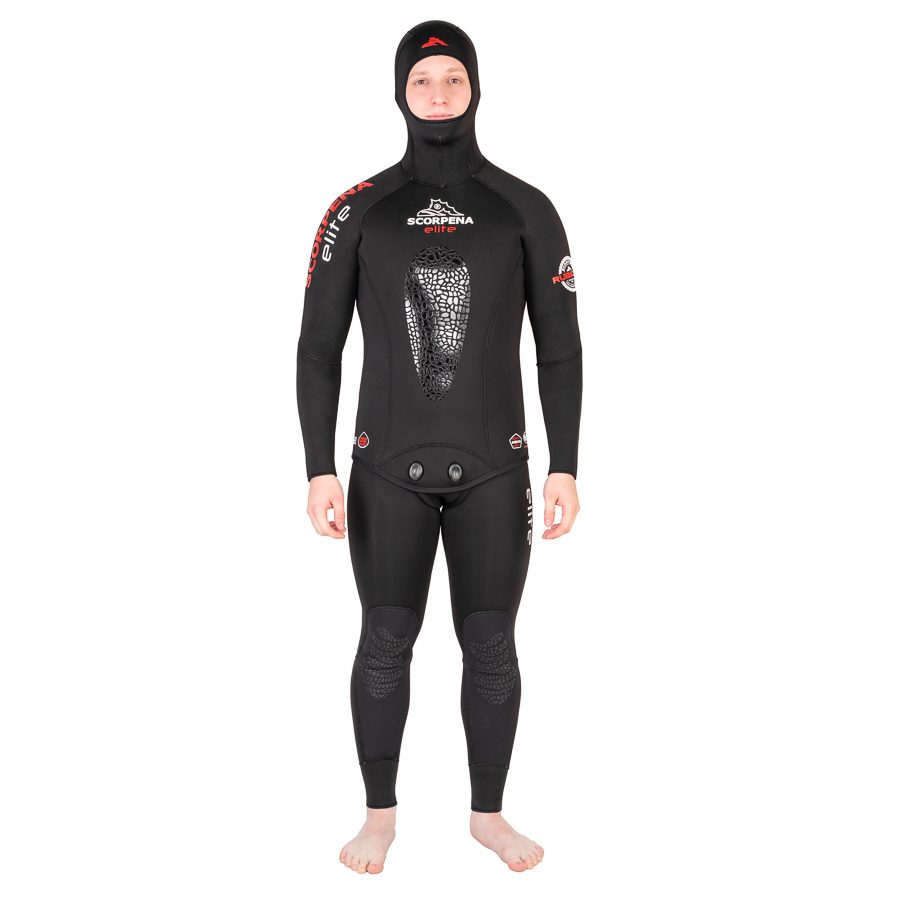 Гидрокостюм Scorpena Elite2 отвечает самым современным требованиям по составу материала и способам его производства. Гидрокостюмы Scorpena Elite2 изготовлены из мягкого и эластичного неопрена фирмы SHEICO, склеены новейшим  клеем на водной основе (без химического растворителя). Затем ткань сшита «слепым» швом (игла не пробивает неопрен насквозь, а только сшивает внешнюю ткань), что препятствует проникновению воды через швы. Все ткани приклеены новейшим неопреновым клеем на водной основе. Сам неопрен из природного сырья и новые клеи которые использовались при производстве позволяет нам включить новейшие костюмы Scorpena Elite2 в экологическую — «»зелёную»» линейку нашего брэнда!Гидрокостюм Scorpena Elite2 имеет проверенную временем и тысячами подводных охотников выкройку из 28 деталей. Модель идеально садится на большинство фигур без зон излишнего натяжения материала, плотно прилегает к телу, обеспечивая максимальную теплоизоляцию. Костюм состоит из куртки с капюшоном и комбинезона с лямками.Внутри костюма открытая пора, с наружной стороны неопрен покрыт высокоэластичным материалом эластан (аналог Lycra). Благодаря резиновой составляющей в нитях материала, такое покрытие почти не ограничивает свойства неопрена к растяжимости. Костюм легко садится по фигуре и не сковывает движения в суставах. Комфортный крой и удобство костюма позволяют охотнику нырять дольше и глубже.Для большего комфорта при заряжании подводных ружей с резиновыми тяжами, костюм Scorpena Elite2 имеет накладку значительно увеличенной толщины в области груди. Области колен на штанинах покрыты износостойким материалом Supratex.Благодаря хорошо продуманному крою шлем гидрокостюма максимально закрывает лоб и подбородок, обеспечивая плотную посадку при свободе движений.Scorpena Elite2 сочетает в себе отличные технические характеристики, минималистичный дизайн и приятную цену.