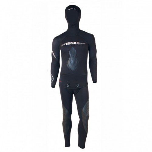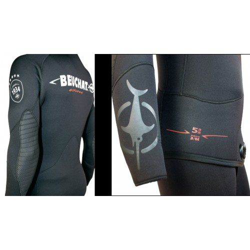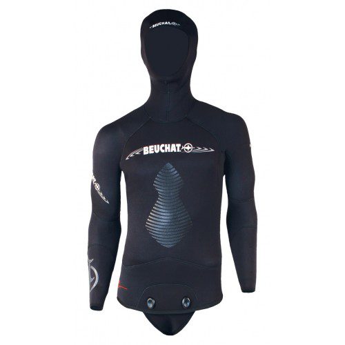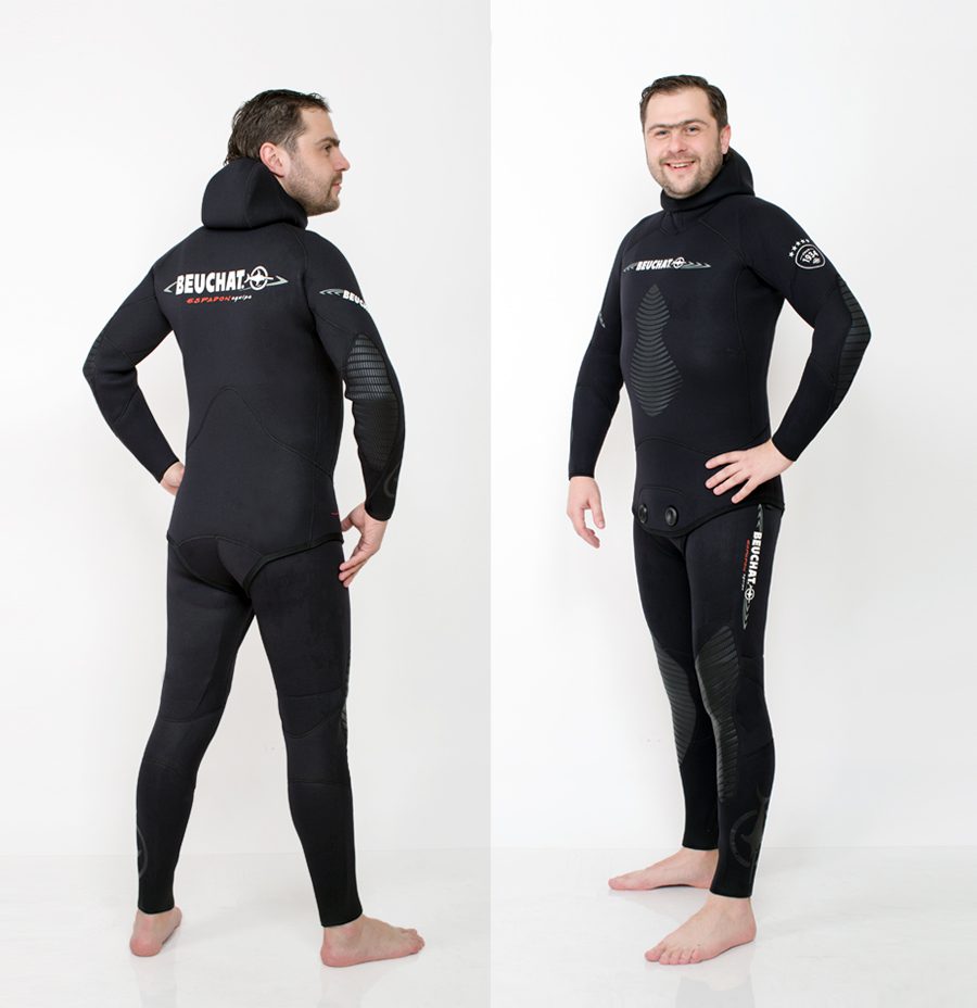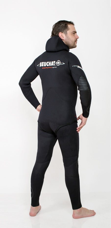 Новинка 2014 года, гидрокостюм BEUCHAT Espadon Equipe пришел на замену модели-бестселлеру Mundial Equipe, взяв от своего предшественника самые лучшие характеристики и добавив к ним еще более усовершенствованный крой (состоит из 21+12 деталей!) и новый динамичный дизайн. Ключевые характеристики Espadon Equipe: Тип: Костюм из двух частей для подводной охоты или фридайвинга. Верхняя часть с капюшоном, комбинезон с наплечными лямками. В версии толщиной 5 мм доступен укороченный сверху комбинезон без лямок. Эластичный неопрен толщиной 3, 5, 7 или 9 мм. Неопрен с открытой порой с внутренней стороны, для обеспечения лучшей термозащиты Дизайн: Черного цвета для меньшей заметности Защита в виде полосок, имитирующая полоски рыбы Анатомический крой: Новый дизайн BEUCHAT, высококачественный анатомический крой — куртка из 21 детали + комбинезон из 12 деталейОбрезанный комбинезон для облегченного одевания Бесшовные эластичные детали на суставах (подмышки, сгиб локтя и внутренняя часть коленей) чтобы предотвратить раздражение кожи. Заданная форма поясничного изгиба и паховой области для более плотного прилегания к телу. Удобные застежки куртки с использованием пластиковых клипс. Защитное покрытие: Двуслойное защитное покрытие из полиуретана, состоящее из раздельных полос для большей гибкости на локтях, коленях и груди. Отделка краев: Неопреновые детали скреплены вместе и обработаны оверлоком снаружи. Края рукавов уплотнены и обметаны эластичным швом. Край куртки обработан эластичной лентой для большей прочности.
