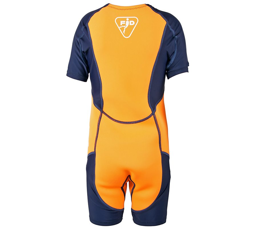 Детский гидрокостюм-шорти из 2 мм неопрена и лайкры (80% нейлон, 20% эластан). Предназначен для плавания в бассейне и сноркелинга в открытой воде. Яркий неопрен на корпусе сохраняет тепло и защищает тело от переохлаждения. Темно-синяя эластичная лайкра на рукавах и штанинах не стесняет движений ни в воде, ни на суше, обеспечивая защиту от солнечных ожогов. 100% защита от УФ излучения. Внутреннее покрытие неопрена – нейлон. Передняя молния с неопреновой планкой изнутри. Размеры: от 4 до 12 лет.