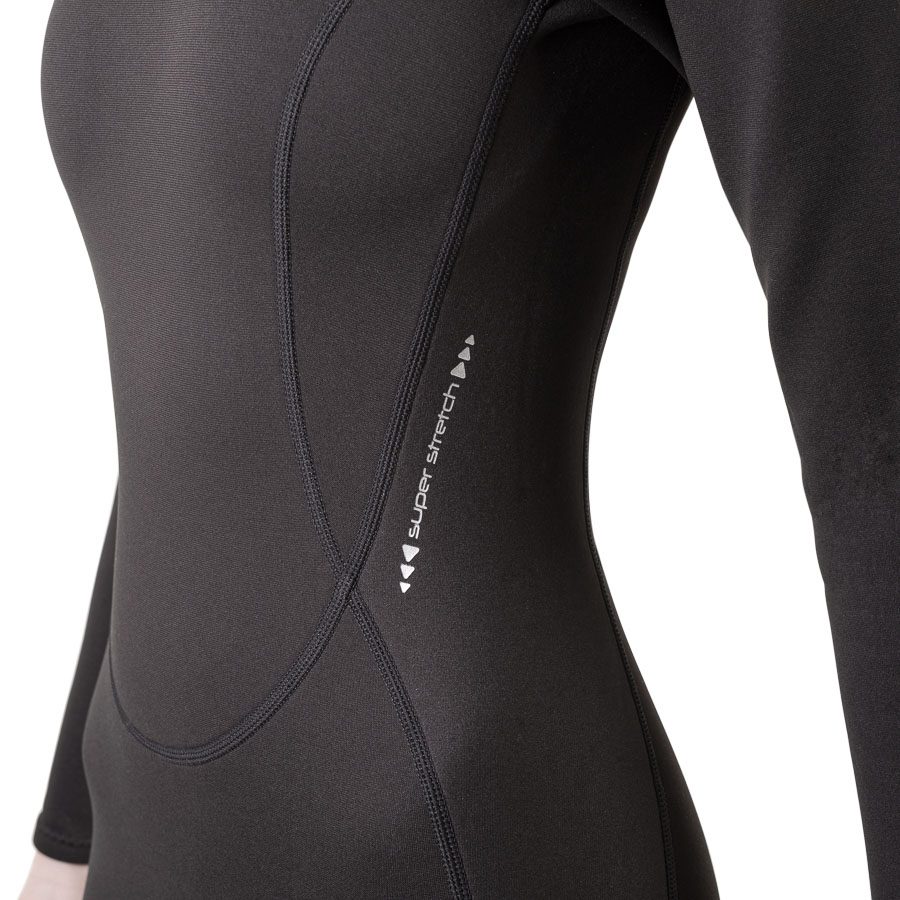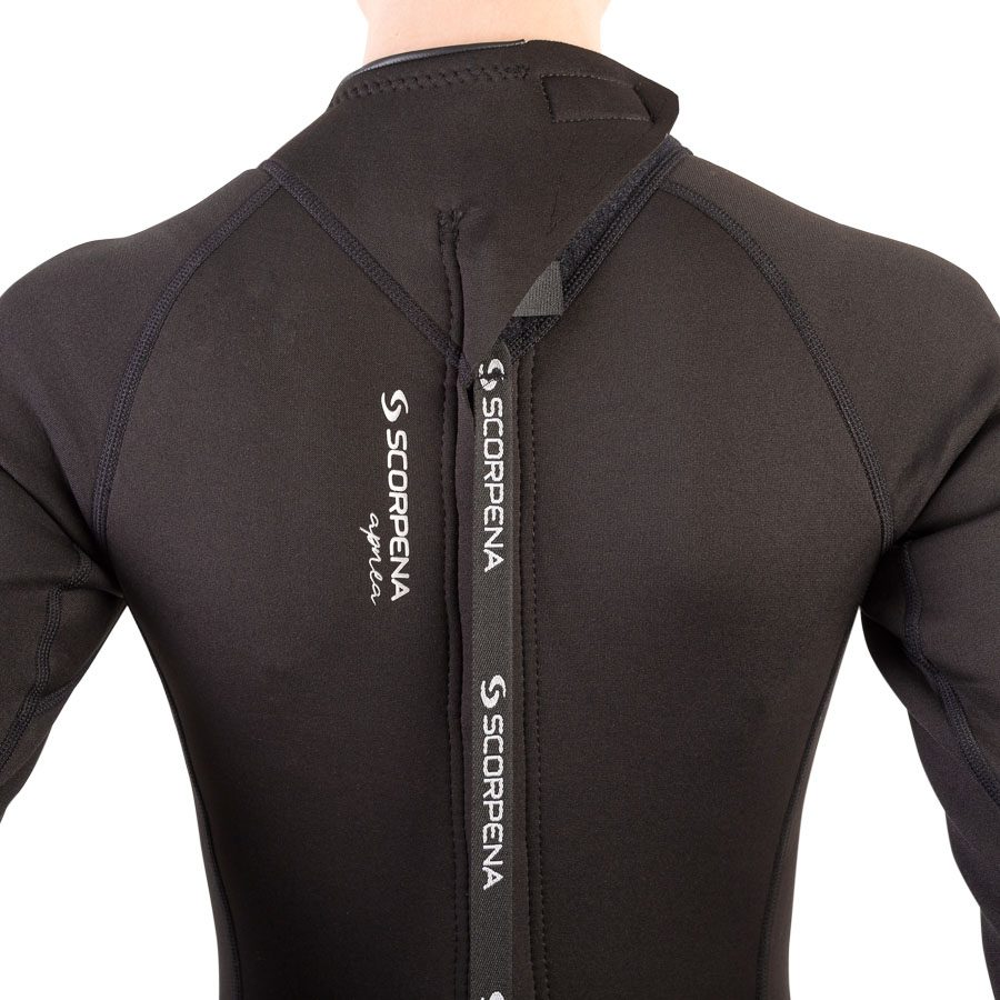 Тонкий женский монокостюм Scorpena Apnea F4 предназначен для занятий водными видами спорта и отдыха как в тёплой открытой воде, так и в бассейне. Он изготовлен из 1,5 мм неопрена с двухсторонним покрытием нейлоном. На сгибаемых частях тела — покрытие с полиуретановыми нитями. Такая комбинация материалов придает костюму эластичность и не ограничивает движения. Костюм застегивается сзади на пластиковую молнию, которая не повергается коррозии в воде. Широкая планка под молнией препятствует попаданию воды под костюм. Для удобства застегивания бегунок оснащен длинной петлей с фактурной поверхностью. Вверху молния прикрыта мягким клапаном с липучкой, который обеспечивает плотное прилегание воротничка к шее и фиксирует бегунок в застегнутом положении. Воротничок окаймлен мягкой манжетой из неопрена со специальным покрытием Аквастоп для предотвращения затекания воды. Сзади он выше и за счет клапана мягче, чем спереди. Это особенно ценно для фридайверов, использующих шейные груза. Удобный анатомически крой и уникальная технология соединения деталей плоским многониточным швом делают этот костюм неощутимым на теле даже при активном движении и долгом нахождении в воде.