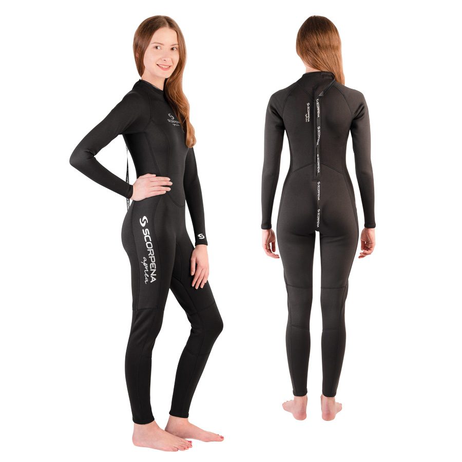 Тонкий женский монокостюм Scorpena Apnea F4 предназначен для занятий водными видами спорта и отдыха как в тёплой открытой воде, так и в бассейне.