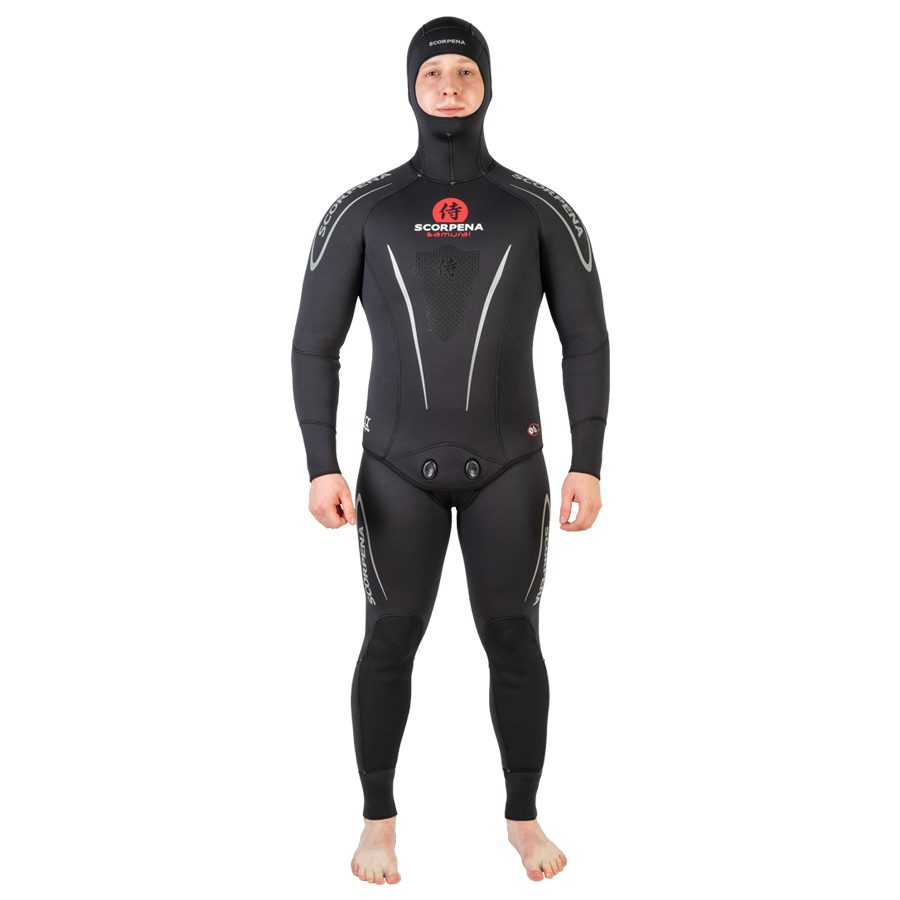 Обновлённый гидрокостюм Scorpena Samurai-2 Yamamoto представляет собой непревзойдённую классику в обновлённом формате! Гидрокостюм изготовлен из легендарного японского неопрена Yamamoto по классической выкройке Scorpena, но с некоторыми изменениями:- для верхней части комбинезона LongJohn мы немного изменили лекала и теперь она сделана более эластичной для лучшего облегания груди и меньшего сопротивления глубокому дыханию. Также теперь у каждого пользователя появилась возможность самостоятельно укоротить эту часть костюма до так называемых «Высоких штанов» (high pants) по любой из намеченных закрепок;- для рукавов мы добавили удлинённые манжеты из неопрена меньшей толщины, с повышенной растяжимостью, чтобы облегание запястий было максимально плотным, а надевание и снимание куртки – ещё более комфортным. Также мы добавили на эти манжеты несколько закрепок для самостоятельной подгонки длины рукавов пользователем;- манжеты штанин тоже стали более длинными для учёта, при необходимости, высокого роста пользователя и получили по три закрепочных шва чтобы каждый подводный охотник мог идеально подогнать длину штанин по своему предпочтению.А в остальном для гидрокостюма Samurai-2 мы использовали нашу проверенную временем и тысячами подводных охотников выкройку. Благодаря её корректировкам по просьбам пользователей, костюм Scorpena Samurai-2 идеально садится на большинство фигур, без излишнего натяжения плотно прилегает к телу, обеспечивая максимальную термоизоляцию.Комфорт использования Scorpena Samurai обеспечивают и материалы: неопрен Yamamoto стал эталоном, благодаря мягкости, устойчивости к износу и выдающимся теплоизоляционным качествам за счёт идеальной плотности и расположению воздушных пузырей в структуре неопрена. Для гидрокостюмов толщиной 5 мм и 7 мм использован Yamamoto No38, а для 9 мм и 10 мм – более эластичный и мягкий Yamamoto No39. Широкая размерная сетка (от S до 4XL) позволяет найти свой размер практически любому подводному охотнику.Внутри костюма открытая пора, а снаружи он покрыт мягкой и прочной нейлоновой тканью, которая обеспечивает стойкость к зацепам, истиранию и износу. Стыки всех деталей выкройки проклеены мягким японским клеем и прошиты слепым швом, на местах соединения нескольких деталей имеются усиления дополнительными накладками.По конструкции гидрокостюм Scorpena Samurai-2 представляет собой комплект из куртки с капюшоном и комбинезона с лямками, который теперь может быть самостоятельно обрезан до высоких штанов.  Края манжет рукавов и штанин, а так же обтюрация шлема – отделаны/обшиты оверлоком, предотвращающим отслаивание ткани по краю. Нижняя часть куртки, а также верх комбинезона обшиты эластичной лентой, которая защищает нейлон от образования «»стрелок»» и усиливает саму конструкцию этих элементов. Ведь эти места подвержены повышенному растяжению в моменты надевания и снятия гидрокостюма.Крой капюшона куртки адаптирован для использования в холодной воде: шлем максимально закрывает лоб и подбородок, обеспечивая плотную посадку при свободе движений.На груди куртки имеется специальная «»накладка»» выполненная напылением из нескользящего полиуретана. Такая накладка делает процесс зарядки в грудь ружья арбалетного типа более комфортным.На коленях комбинезона предусмотрены вставки из износостойкого материала Supratex, устойчивому к образо