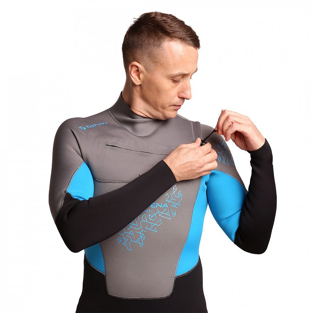 Новый, стильный и технологичный гидрокостюм в коллекции — Scorpena Tahiti (Таити) предназначен для занятий большинством видов водного спорта, в том числе: виндсерфингом, кайтсерфингом, сапбордингом, водными лыжами, вейкбордингом, бодибордингом, сноркелингом, скимбордингом, дайвингом, флайбордингом, гидрофойлингом, рафтингом, каякингом, при прогулках на аквабайках/гидроциклах и катании на глиссерах, скутерах и т.п.Костюмы Scorpena Tahiti имеют сложную конструкцию: при его производстве использовано несколько видов неопрена разной толщины и с разными покрытиями.Основная часть костюма на теле пловца изготовлена из 4 мм высокоэластичного неопрена для максимальной термоизоляции при минимальном сковывании движений с большой амплитудой, то есть для активного отдыха. Несмотря на увеличенную толщину неопрена, этот костюм облегает тело практически как вторая кожа и совсем скоро перестаёт ощущаться, обеспечивая приятное тепло при высочайшей свободе передвижений. Также этому способствует неопрен высокого качества и текстильные покрытия с обеих сторон, в которых используются полиуретановые нити перекрёстного плетения, что позволило достичь практически одинаковой растяжимости в любом из направлений.Манжеты гидрокостюма, то есть рукава от локтей, штанины ниже колен, а также воротничок и промежность выполнены из более тонкого неопрена 3 мм для ещё большей эластичности, чтобы костюм плотнее облегал фигуру и сохранял тепло, не сковывая при этом широкоамплитудных движений конечностей, стремительных выпадов и наклонов во всех плоскостях. Удобный крой и проклеенные в торец, а затем прошитые снаружи «слепые» швы обеспечивают высокий комфорт при использовании гидрокостюма Scorpena Tahiti. Пересечения швов усилены изнутри дополнительными накладками. Они же предотвращают натирания кожи в этих местах. На воротничке гидрокостюмов применён особый ультра растяжимый неопрен, который бережно относится к нежной коже шеи и обеспечивает наиболее плотное и комфортное прилегание к телу препятствуя, тем самым, проникновению воды под костюм.Но самое главное отличие костюма Scorpena Tahiti от большинства других – в системе надевания костюма и его застёгивании. Ранее монокостюмы застёгивались на длинную молнию, проходящую вертикально спереди или сзади. Но у таких костюмов есть несколько существенных недостатков, главный из которых – полная нерастяжимость застёжки-молнии. То есть при расположении молнии по спине наклоняться вперёд было затруднительно: застёжка натягивалась и воротничок неприятно давил на горло. К тому же основание (начало) молнии на пояснице подвергалось чрезмерному натяжения и, со временем, иногда надрывало неопрен в месте вшивания застёжки. Костюмы с передней молнией были лишены этого недостатка, но надевать их в одиночку было не очень удобно, а при наклоне вперёд молния собиралась складками и пропускала большой объём прохладной воды под костюм. Тут проявлялся второй недостаток молний – их негерметичность. То есть чем молния короче – тем меньше воды она пропускает внутрь, но тем менее удобно надевать такой костюм.Оба описанных выше недостатка минимизированы в гидрокостюмах с верхним расположением молнии. В этом случае вход в гидрокостюм осуществляется сверху, через своеобразный угловой клапан-воротник.- Горизонтальная часть этого клапан