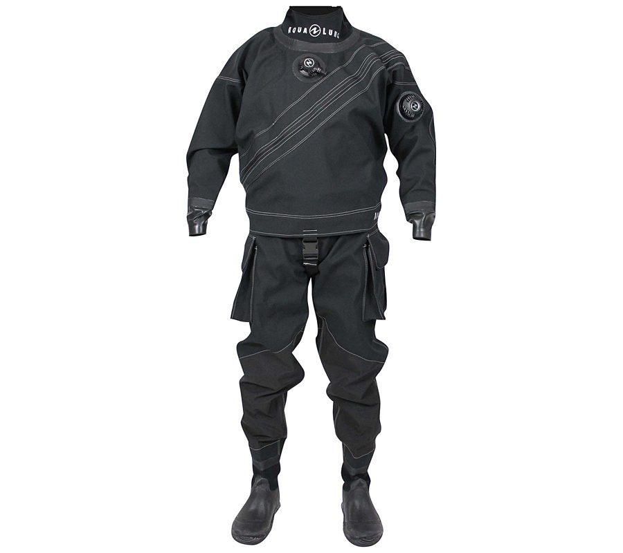 Сухой костюм среднего ценового диапазона с диагональной передней молнией, которая позволяет дайверу застегиваться самостоятельно.