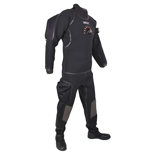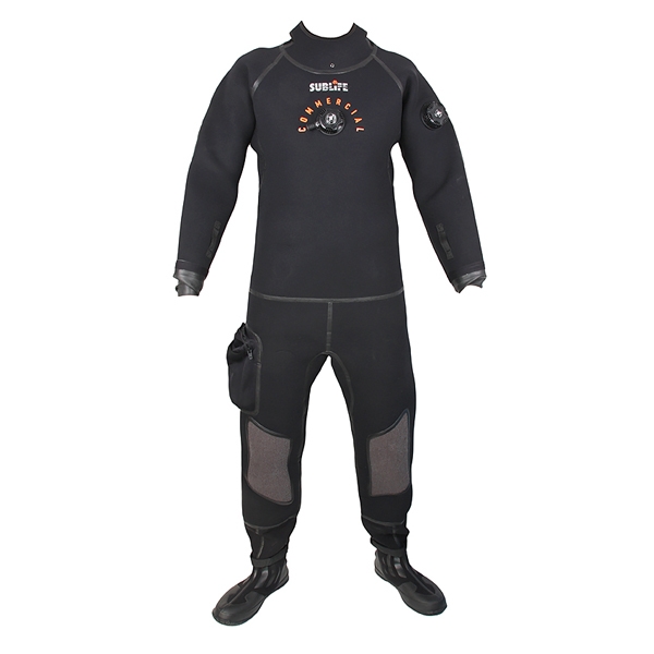 Сухой гидрокостюм Sublife Commercial выполнен из неопрена W-7 Namleong толщиной 4,5 мм и предназначен для погружений в холодной воде, отличается прочностью и износоустойчивостью материала, подходит для активного использования. Рекомендуется для погружений до 50 метров. Оснащен клапаном поддува с боковой кнопкой и регулируемым стравливающим клапаном. Клапаны SI-TECH. Швы снаружи обработаны технологией Liquid Seal. Внутренний шов проклеен лентой для лучшей водонепроницаемости и усиления. Модель снабжена вклеенными ботами 5 мм, подтяжками, карманом на бедре и усиленными кевларовыми наколенниками. На руках и шее установлены латексные манжеты. Шейный латексный манжет закрыт неопреновым воротником на липучках с  дренажным отверстием. Костюм комплектуется сумкой, шлангом поддува и ремкомплектом. Задняя металлическая молния производства КНР. Материал: неопрен 4,5 мм. Вклеенные боты толщиной 5 мм с затяжкой на липучке. Карман на бедре с люверсом внизу и молнией сверху. Кевларовые наколенники для большей устойчивости к истиранию. Латексная обтюрация. Встроенные подтяжки.