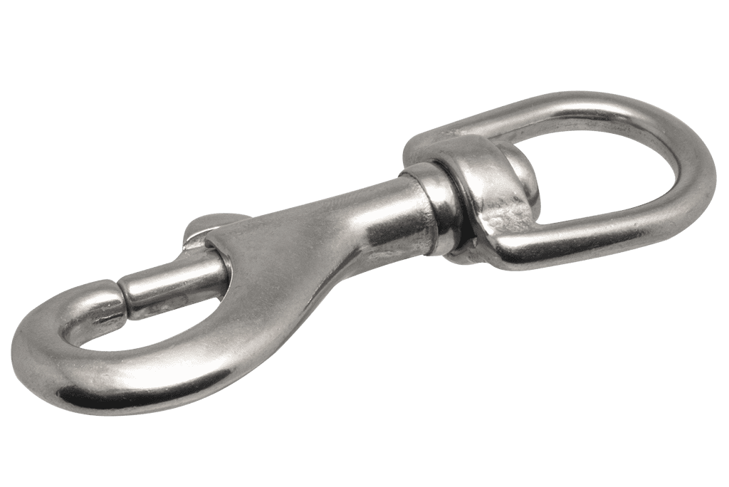 Карабин с кольцом из нержавеющей стали А4 Поворотный карабин состоит из крюка с пружинной защелкой и кольца (вертлюга), способной вращаться на 360 градусов вокруг своей оси. Пружинная защелка открывается нажатием пальца и запирается при отпускании. Размеры — 75, 90, 120мм