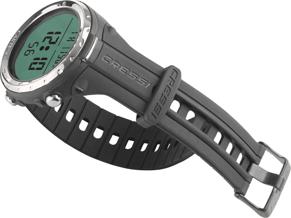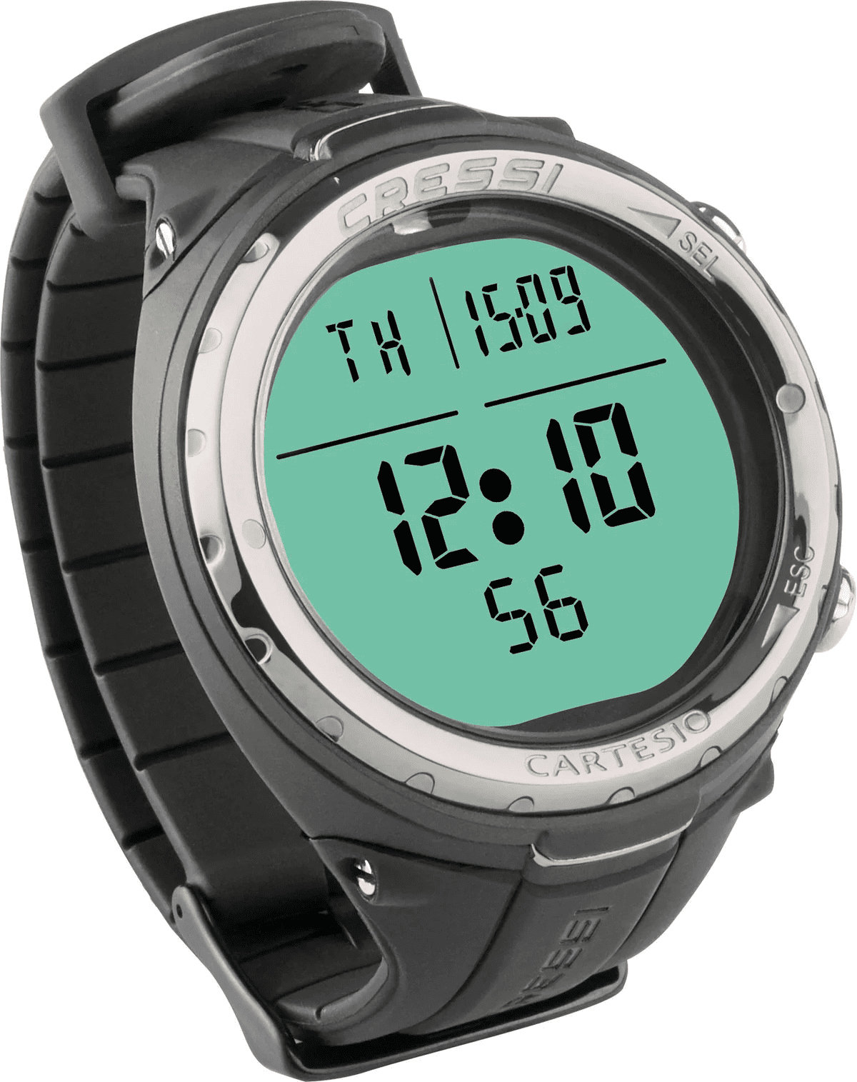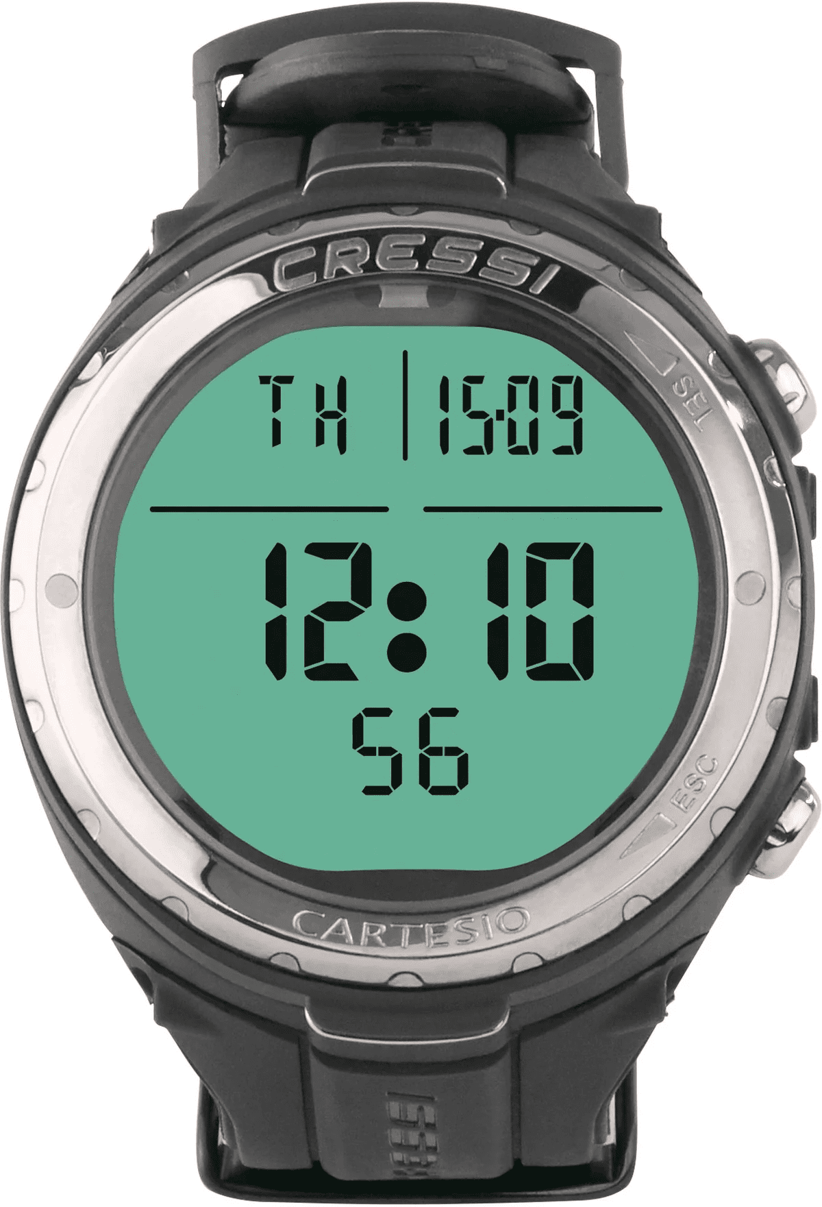 Компьютер Cressi Cartesio — компактный наручный компьютер, диаметр всего 48 мм, а диаметр высококонтрастного дисплея 38 мм. Дисплей изготовлен из минерального стекла, сверхпрочный противоударный корпус со стальной рамкой. Браслет выполнен из высококачественной резины с пряжкой из нержавеющей стали. Задняя крышка выполнена из металла в сочетании с пластиковыми вставками. Можно использовать на глубине до 120 метров. Компьютер Cressi CARTESIO порадует всех дайверов, фридайверов и подводных охотников. Это также идеальный компьютер для других подводных занятий, благодаря возможности деактивировать функции «погружения», что позволяет избежать ненужных тревог, когда Вы просто плаваете.