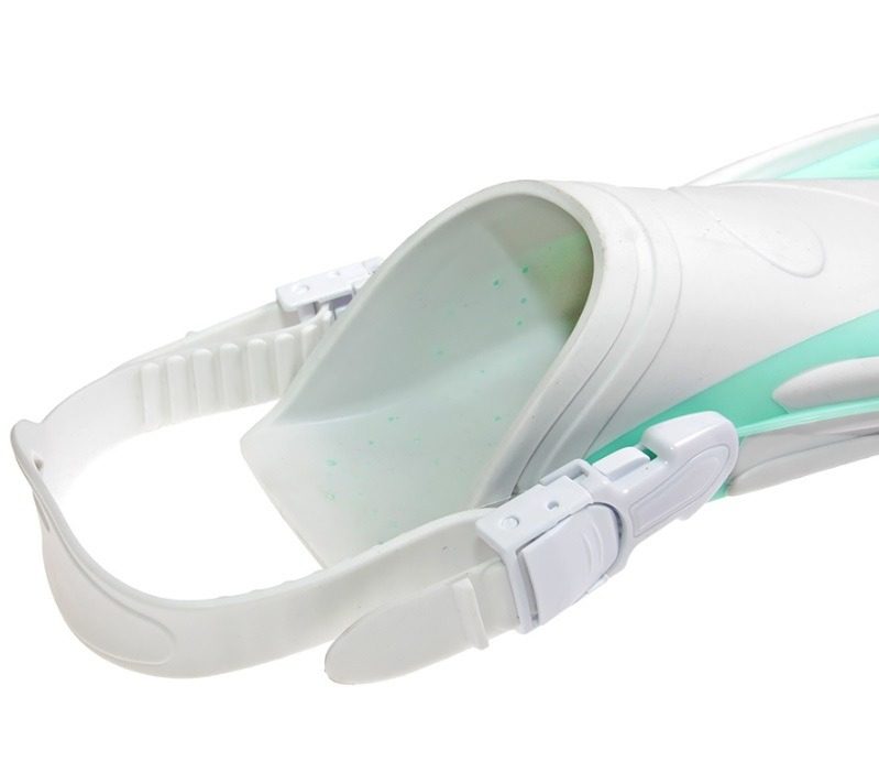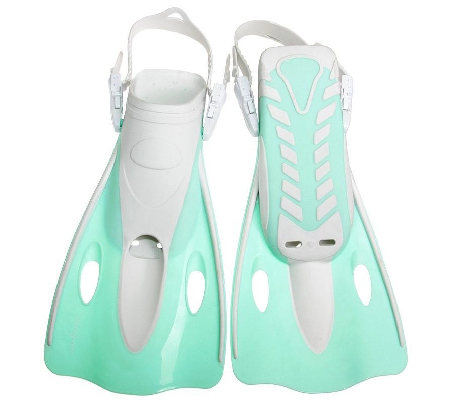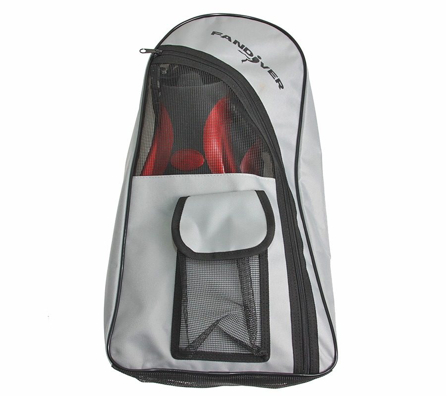 Укороченные пластиковые ласты с открытой пяткой и регулируемыми силиконовыми ремешками. Трубка с дренажной камерой и стравливающим клапаном. Сверху трубка имеет сухой клапан, защищающий от попадания воды. Однолинзовая маска с закрытым носом и боковыми регулируемыми пряжками. Линза маски из закаленного стекла позволяет погружаться на глубину. Специальная сумка-рюкзак на молнии для переноски и хранения. У сумочки есть сетчатые вставки и спереди небольшой дополнительный кармашек на липучке.