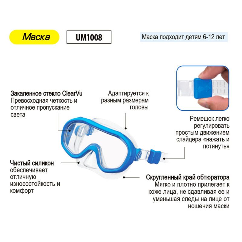TUSA Sport Комплект маска + трубка UC0211P детский/подростковый Яркий детский комплект для плавания состоит из маски, трубки и сумки для переноски и хранения. 100% силикон комфортен и безопасен. закаленные стекла надежно защищают глаза ребенка, устойчивы к царапинам, трубка – оптимальна для начинающих. Маска подходит для детей от 6 до 12 лет Маска UM1008 Закаленное стекло ClearVu Превосходная четкость и отличное пропускание света Адаптируется к разным размерам головы Ремешок легко регулировать простым движением слайдера «нажать и потянуть» Скругленный край обтюратора Маска мягко и плотно прилегает к коже лица, не сдавливая ее и уменьшая следы на лице от ношения маски Трубка UN0102 Волноотбойник Hyperdry Препятствует захлестыванию воды в трубку Чистый силикон обеспечивает отличную износостойкость и комфорт Трехмерный изгиб трубки для эргономичного положения Пристегните/отстегните к ремешку маски одним движением при помощи удобного адаптера Эластичное силиконовое сочленение уменьшает напряжение при удерживании рубки во рту Цвет: голубой, желтый, розовый