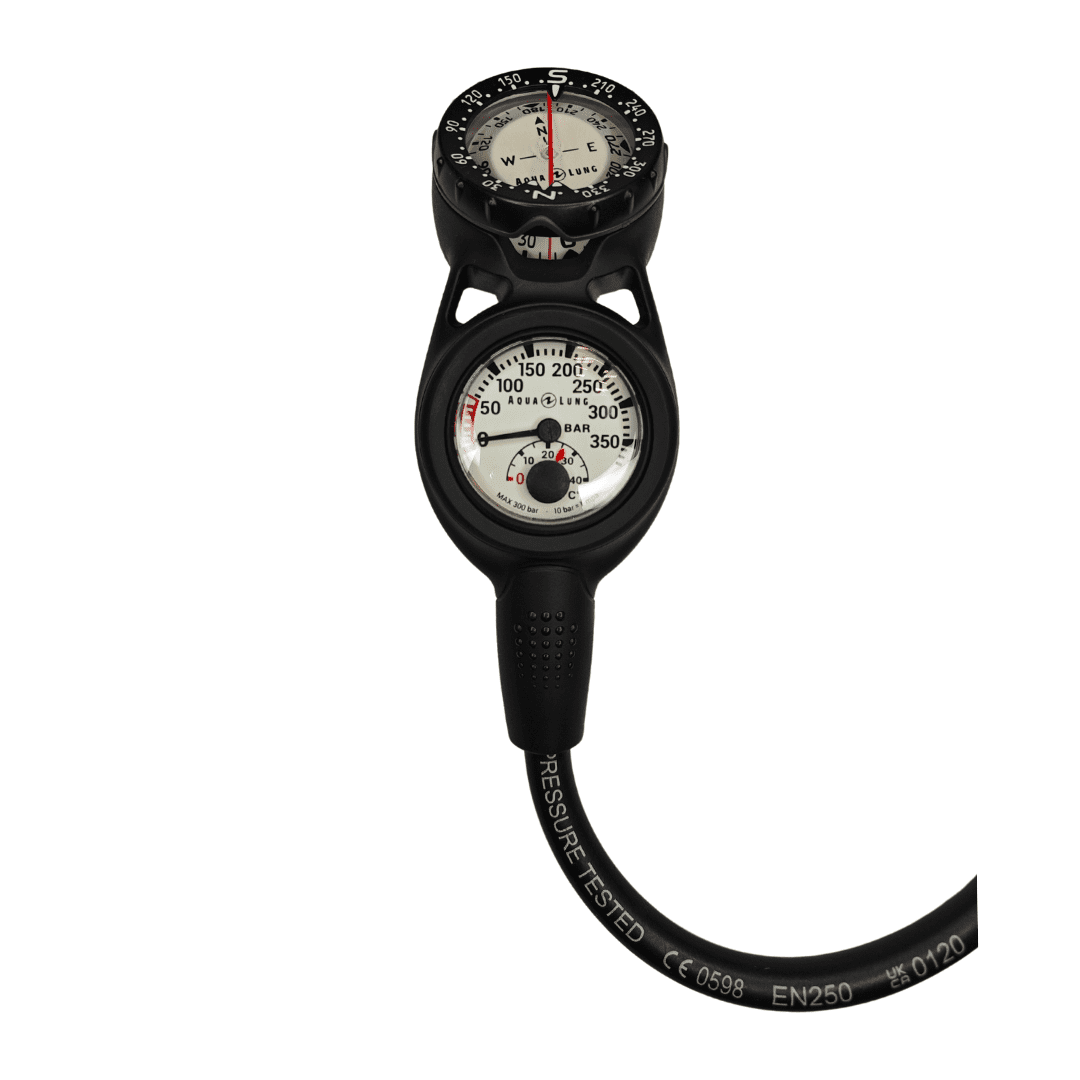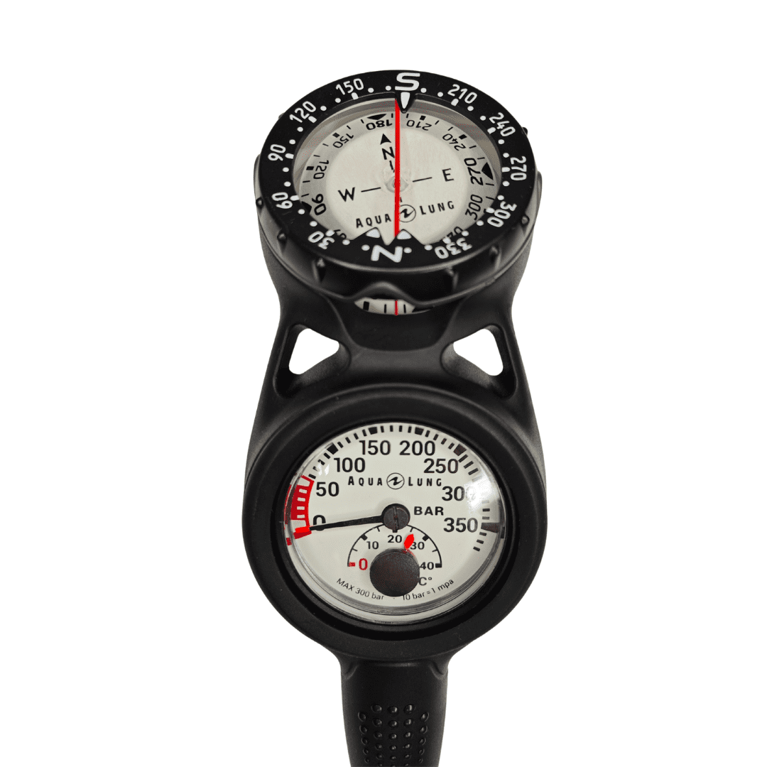 Компактная двухприборная консоль, состоящая из манометра с термометром и компаса. Манометр- До 350 бар.- Люминесцентный экран.- Встроенный термометр.- Совместимость с Nitrox до 50%.- Ударопрочная трубка Бурдона.- Предохранительный клапан.- Длина шланга 90 см. Компас- Крупные, хорошо читаемые цифры.- Большой экран.- Большой лимб на 360°.- Люминесцентное покрытие.- Светящиеся метки на 10°, 20°, 30° и 130° хорошо видны в условиях недостаточного освещения.