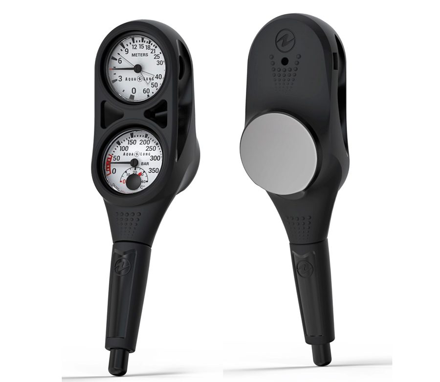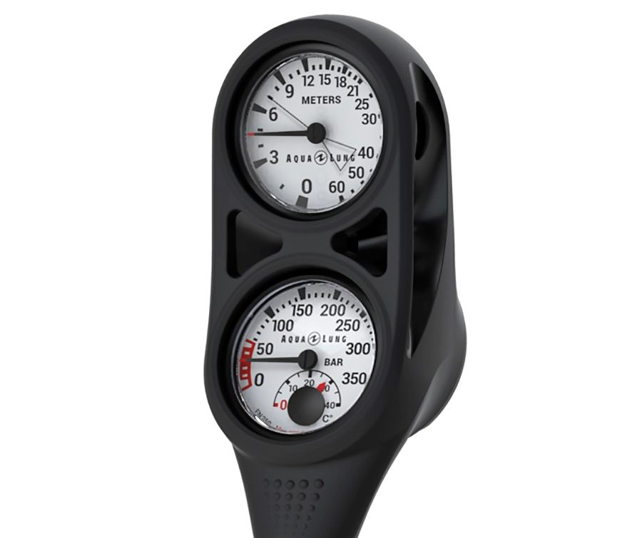 Компактная двухприборная консоль, состоящая из манометра с термометром и глубиномера. Манометр- До 350 бар.- Люминесцентный экран.- Встроенный термометр.- Совместимость с Nitrox до 50%.- Ударопрочная трубка Бурдона.- Предохранительный клапан.- Длина шланга 90 см. Глубиномер- Прогрессивно проградуированная шкала для точного определения глубины на мелководье. Длинный ремешок позволяет надевать глубиномер на рукав сухого гидрокостюма.- Индикатор максимальной глубины.- Люминесцентный экран.- 200 футов / 60 м.