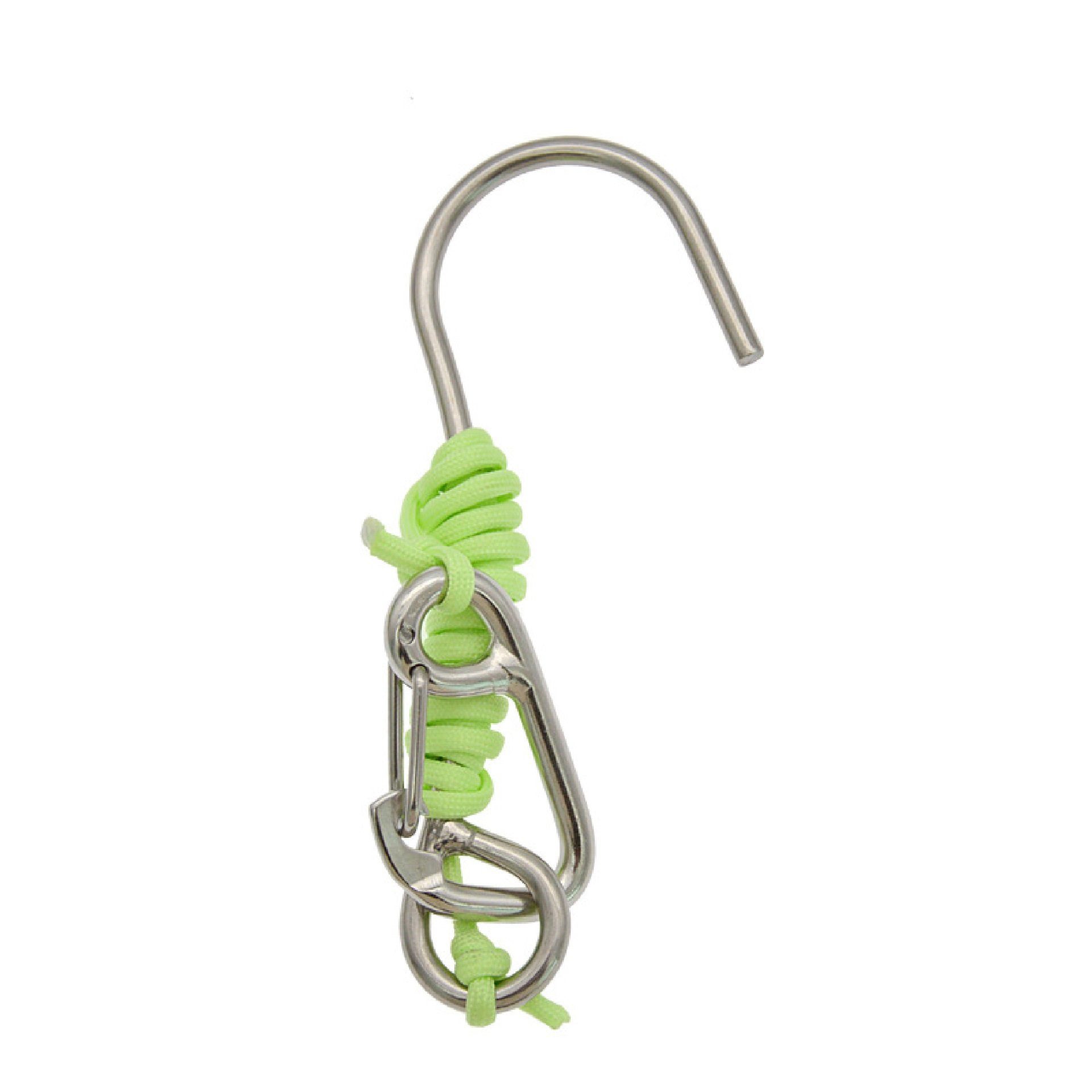 Рифовый крюк с карабином и линем даёт возможность дайверу закрепиться в одном месте в условиях сильного течения. Устройство особенно полезно подводным фотографам, которым нужны обе свободные руки для управления фотоаппаратом или видео камерой. Стальной рифовый крюк с желтым линем длиной 1 м. При выборе места фиксации крюка нужно быть осторожным, чтобы не повредить коралловый риф и не разрушить место обитания подводной живности. Наилучшим образом подходят расщелины и выпуклости рельефа без наличия живой растительности. Одинарный стальной крюк 146 мм Стальной карабин длиной 60мм Удерживающий линь длиной 100мм Линь светится в темноте Вес 79 грамм