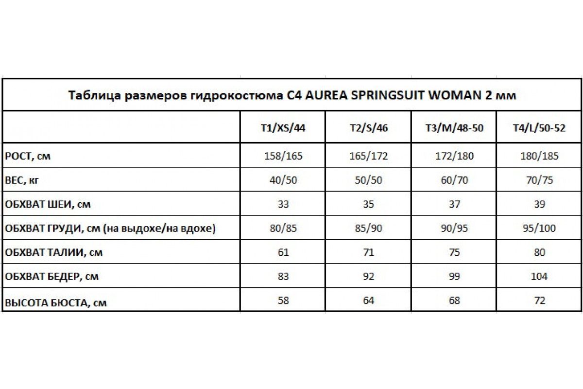 Гидрокостюм C4 AUREA SPRINGSUIT WOMAN 2 мм, с рукавами специально разработан для фридайвинга, плавания в открытой теплой воде и бассейне. Костюм AUREA SPRINGSUIT WOMAN изготовлен из неопрена GLIDE SKIN снаружи и эластичного неопрена с подкладкой из нейлона внутри, он изготовлен специально для женщин и повторяет анатомию женского тела. Этот костюм одевается на сухую, он не требует намачивания перед одеванием, что очень удобно и практично.AUREA SPRINGSUIT WOMAN обладает компрессионной устойчивостью, отличной термоизоляцией и эластичностью. Молния расположена впереди, доступ к ней максимально удобен, и она не сковывает движения. Золотистая карбоновая расцветка костюма предает ему уникальность и неповторимый стиль.Неопреновая пена гидрокостюма AUREA SPRINGSUIT WOMAN сертифицирована и в ее составе отсутствуют какие-либо химические вещества, которые могут нанести вред здоровью человека или окружающей среде, таких как фталаты и латекс.Костюм C4 AUREA SPRINGSUIT WOMAN выполнен по типу кроя реглан, обеспечивая плотное и комфортное прилегание костюма, благодаря чему попадание воды под костюм маловероятно.Швы костюма проклеены специализированным неопреновым клее, а снаружи имеют двухниточное плетение, внутри швы гладкие, без ступенек.Костюм C4 AUREA SPRINGSUIT WOMAN отлично подойдет как поддевка к стандартному гидрокостюму, в случаях, когда нужно утеплиться.Гидрокостюм C4 AUREA SPRINGSUIT WOMAN прекрасно подойдет для занятий дайвингом, снорклингом, фридайвингом, подводной охотой, серфингом, виндсерфингом, кайтсерфингом, вейкбордом, катания на гидроцикле, водных лыжах и заплывов на SUP доске.Гидрокостюм AUREA SPRINGSUIT WOMAN производятся в одной толщине — 2 мм и доступен в четырех размерах: T1/XS/44, T2/S/46, T3/M/48-50, T4/L/50-52. AUREA SPRINGSUIT WOMAN был разработан с минимальным количеством деталей, чтобы повысить комфорт и эластичность костюма.Гидрокостюм C4 AUREA SPRINGSUIT WOMAN отлично сочетается с маской C4 FALCON AUREA, трубкой C4 MISTRAL AUREA и ластами C4 UMBERTO PELIZZARI AUREA. Гарантия на проклейку швов 1 год.Рекомендации: внутреннее покрытие костюма C4 AUREA SPRINGSUIT WOMAN — нейлон и такой гидрокостюм следует надевать на сухую, без смачивания. Гидрокостюм одевается на сухую кожу, мочить ни себя, ни костюм не нужно, это затруднит его одевание.Меры предосторожности: костюм необходимо подобрать по своим размерам, он должен сидеть немного свободно, не должен давить и пережимать — это может нарушить циркуляцию крови.Характеристики:- рекомендации по применению: подводная охота, фридайвинг, дайвинг, пляж и снорклинг, бассейн, триатлон, сапбординг, кайтсерфинг, виндсерфинг, SUP board;- модель: AUREA SPRINGSUIT WOMAN, с рукавами;- тип костюма: короткий монокостюм;- толщина, мм: 2;- расположение молнии: переднее;- материал: неопрен;- неопрен: SHEICO;- внешнее покрытие: неопрен GLIDE SKIN;- внутреннее покрытие: нейлон;- рекомендуемая температура воды: от +22⁰С до +30⁰С;- наличие шлема: нет;- защита на локтях: нет;- тип кроя: анатомический;- размерный ряд: T1/XS/44, T2/S/46, T3/M/48-50, T4/L/50-52;- пол: женский;- цвет: черно-золотой;- бренд: C4 CARBON;- страна бренда: Италия;- страна производства: Китай.