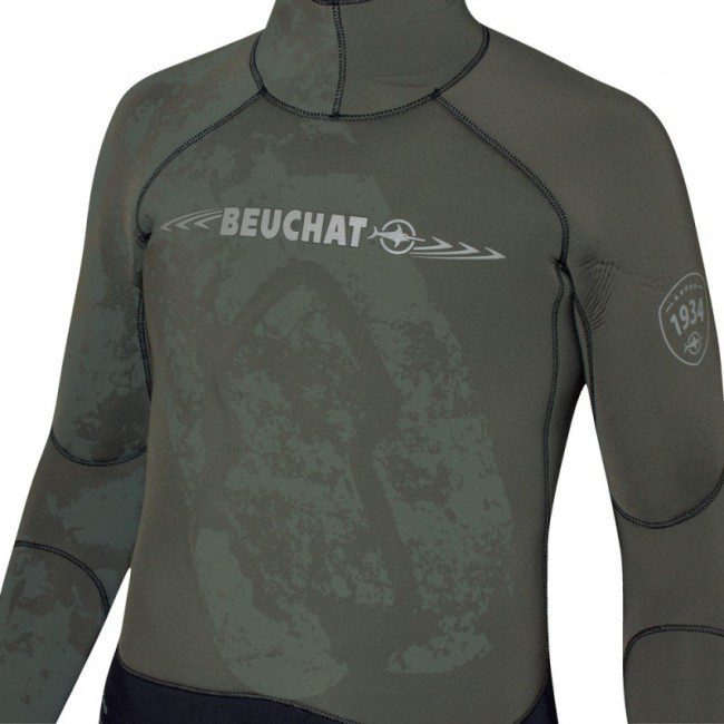 Куртка с капюшоном толщиной 5 мм. Внутри куртки – “открытая пора” для максимальной теплоизоляции. Крой: Конструкция костюма разработана с учётом анатомических изгибов тела. Продуманный покрой предотвращает образование водных карманов на спине и между плечами. В штанах “лонг джон” используется более тонким материалом на лямках: 5 мм для 7 мм костюма и 3 мм для костюма толщиной 5 мм. Аналогично спроектирован капюшон куртки: 4 мм для 5 мм костюма и 6 мм для 7 мм костюма. На сгибах локтей и под коленями – детали из тисненого материала для облегчения движений в суставах. На внешней стороне коленей и локтей – максимально тянущиеся панели. Костюм плотно облегает облегает нижнюю часть тела, уменьшает трение и натяжения материала в седле штанов. Застёжка – двойная клипса. Капюшон с системой Anti-Squeeze в области ушной раковины обработан изнутри тканью, что упрощает компенсацию давления в ушах во время погружений. Камуфляж Magic Camo: Натуральный цвет камуфляжа проявляется только в воде после намокания. На суше костюм не привлекает к себе лишнего внимания. Камуфляж нанесен зонально, чтобы еще больше разбить силуэт охотника под водой и сделать его незаметным. Усиления и отделка: Удлиненные защитные детали из эластичного Supratex 2 на локтевых частях и коленях, нагрудная накладка для удобства заряжания длинных и мощных ружей препятствует проскальзыванию ружья. Лицевой обтюратор выполнен из более тонкого неопрена (на 1 мм тоньше основной толщины костюма) для комфорта про носке и лучшего прилегания к поверхности кожи лица. Детали костюма состыкованы край-в-край и обработаны оверлоком. Края отделаны эластичным кантом для обеспечения лучшей водонепроницаемости, укрепляет края и придает костюму законченный совершенный облик.