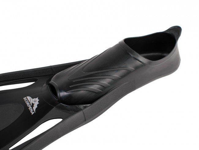 Ласты Scorpena RedLine подобраны специально для начинающих подводных охотников. Лопасть ласты средней длины дает возможность плыть и заныривать без напряжения. Калоша ласты изготовлена из мягкого материала, чтобы не перегружать стопу подводного охотника. Лопасть расположена под небольшим углом к калоше ласты, чтобы также разгрузить стопу во время продолжительного плавания. Ласты выполнены из комбинированного материала:  гибкие участки лопасти интегрированы в упругие сегменты. Эта комбинация создает гибкую центральную зону, которая растягивается при сильном гребке, увеличивая поверхность лопасти и обеспечивая опору для мощной работы ластами. Иногда это техническое решение применительно к ластам называют «»туннельным эффектом»», так как упругая часть лопасти при гребке образовывает жёлоб, ориентирующий поток воды в нужном направлении. Во время расслабленного плавания лопасть ласты складывается, снижая нагрузку. Для этой же цели служат специальные отверстия в лопасти. Иногда эти  отверстия называют «»ламинаризаторами потока»»Жесткие кромки ласты (рёбра жёсткости) держат форму лопасти и вода во время гребка остается внутри лопасти, что также дает возможность плыть с меньшими затратами сил.