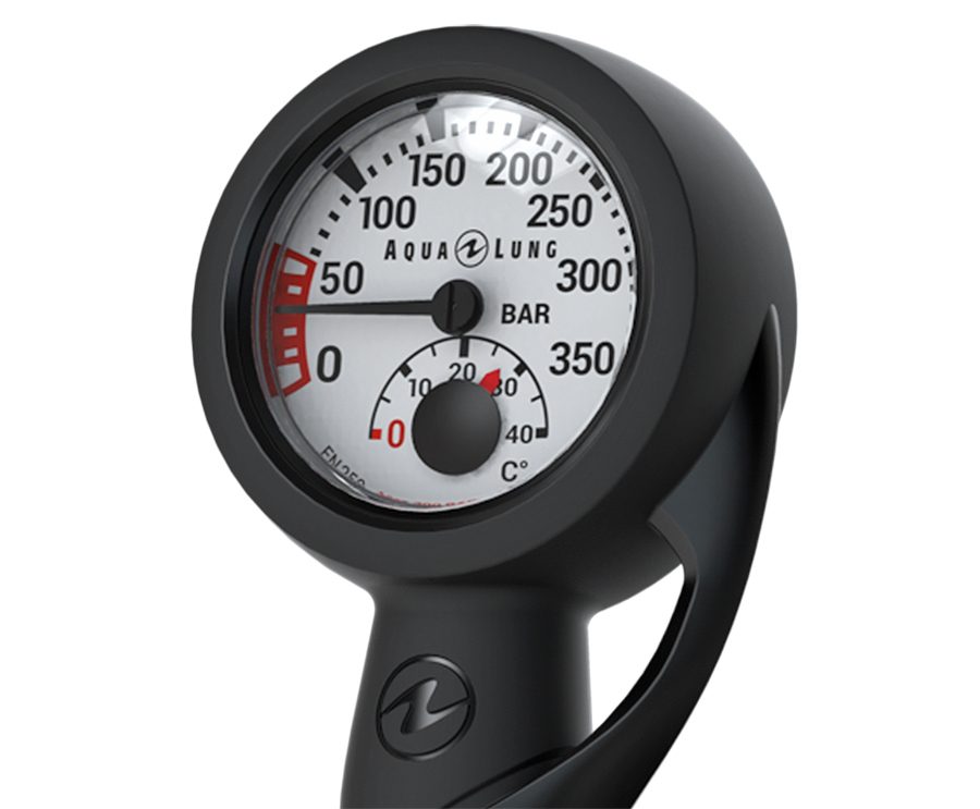 Манометр с термометром До 350 бар.- Люминесцентный экран.- Встроенный термометр.- Совместимость с Nitrox до 50%.- Ударопрочная трубка Бурдона.- Предохранительный клапан.- Длина шланга 90 см.