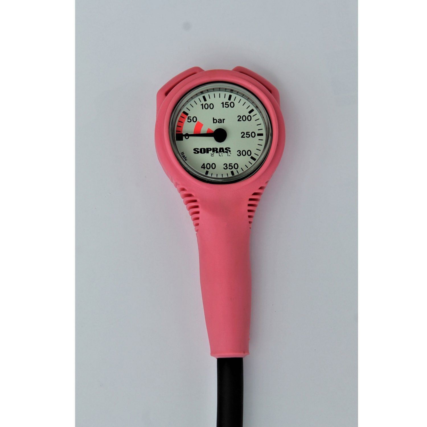Компактный манометр для дайвинга в ударопрочном обрезиненом металлическом корпусе и шлангом 80 см. Особенности: Диаметр 45 мм. Корпус из никелированной латуни Светящийся циферблат Погрешность +/- 1,5% Рабочее давление 300 бар / тестовое – 350 бар. Разрывное давление 1300 бар, коэффициент безопасности 5:1 Шланг длиной 80 см. Материалы : пластик, полиуретан, резина, металл