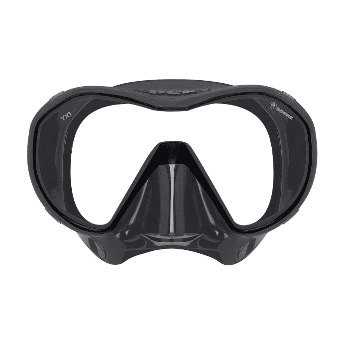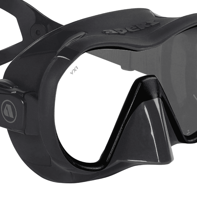 Маска для дайвинга и плавания VX1 Apeks Техническая маска премиум-класса, изготовленная по технологии frameless из хирургического силикона высочайшего качества. Компактная и легкая, она обеспечивает великолепный обзор и непревзойденный уровень комфорта. Это первая маска в линейке Apeks.                  ОСОБЕННОСТИ VX1        Безрамная конструкция (с применением технологии Micromask — уменьшенный объем подмасочного пространства при увеличенном поле зрения)               Помимо версий с прозрачными линзами выпускается также маска линзами, защищающими от УФ излучения и отражающими яркий свет        Регулируемые одним прикосновением пряжки. Натяжение ремешка легко и удобно регулировать даже в толстых перчатках.        Teхнология улучшенного прилегания Advanced Fit. Плотное и комфортное прилегание достигается использованием силикона разной плотности в разных областях обтюратора.        3D-сферический ремешок плотно обхватывает затылок и надежно удерживает маску на месте        Цветные силиконы: ченый и белый        Линзы: прозрачные и с анти-УФ напылением        Пряжки: плоские, надежные, легко регулируемые         Защитный кейс в комплекте