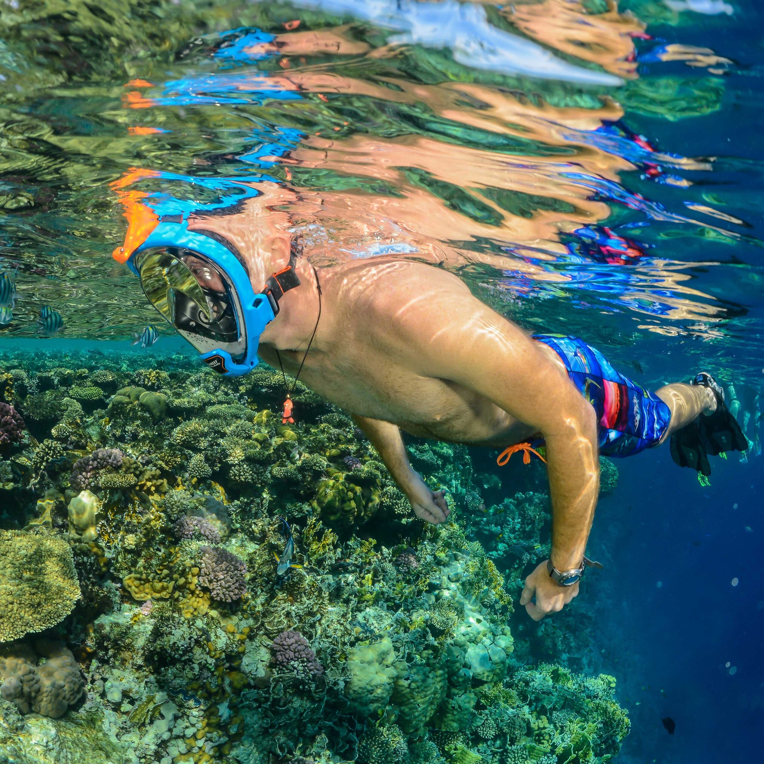 Маска полнолицевая Oceanreef QR+ для сноркелинга предоставляет уникальную возможность познакомиться с подводным миром тем, кто хочет получить максимальный комфорт при плавании с маской и трубкой. Благодаря запатентованной системе поступления воздуха маска не потеет. Внутреннее пространство маски разделено на 2 части: Ocean Reef Aria QR+ отличется от предшественницы новым дизайном, клапаном выдоха, визор сделан тонированым для защиты от ярких солнечных лучей, новая система пряжек облегчает использование. Гипоалергенный силикон стал ещё эластичнее.Ocean Reef Aria QR+ Благодаря запатентованной системе поступления воздуха маска не потеет! Работает полнолицевая маска Ocean Reef Aria QR+ следующим образом: внутреннее пространство маски разделено на две части, вдыхаемый воздух поступает через специальный канал в дыхательной трубке и омывает переднее стекло в маске также, как это происходит в вашем автомобиле при выборе режима обдув стекла. Далее воздух поступает через невозвратные клапаны в область носа и рта. Вы можете дышать свободно носом в полнолицевой маске для сноркелинга также комфортно как и на поверхности! Выдыхаемый воздух выводится напрямую в воду через клапан выдоха и не смешивается со вдыхаемым. Таким образом не образуется мертвого пространства и не повышается концентрация углекислого газа при вдохе. Попадающая в маску вода скапливается в нижней части маски и не мешает обзору и не вызывает раздражения глаз.Верхняя часть трубки оборудована волноотбойником и сухим клапаном, предотвращающим попаданию воды при нырянии. Силиконовая обтюрация S-образной формы надежно изолирует внутреннее пространство маски от попадания воды, не оставляя на лице следов. Система креплений на защёлках позволяет быстро снять/подогнать маску и не запутывает длинные волосы. С помощью специального держателя можно присоединить к маске экшен камеру Go Pro (продается отдельно). Маска позволяет разместить внутри оправу для очков (продается отдельно), а также подобрать индивидуальный цвет ремней крепления. Характеристики Ocean Reef Aria QR+: Стильный дизайн. Широкая цветовая гамма. Три размера. Высокое качество изготовления. Обзор на 180 градусов. Тонированное стекло. Регулировочные ремни на защёлках. Трубка с сухим клапаном. Защита от запотевания. Разработка и производство в Италии!