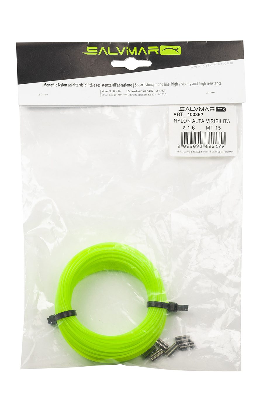 Монолинь или мононить используется для крепления гарпуна к ружью. В отличии от веревочных линей, монолинь имеет память и за счет этого удобно укладывается при слиновке ружья. Также монолинь надежнее чем веревочный линь, так как не подвержен процессу корозии. Особенно это важно при охоте в соленой воде. Привязывается монолинь к гарпуну с помощью обжимных трубок, которые идут с ним в комплекте, в данном случае 6 штук. 15 метров монолиня хватит на то чтобы привязать три гарпуна к ружьям длиной до 85 см. и два гарпуна к ружьям длиной 95 и более. И само собой, у подводного охотника всегда должен быть с собой запасной линь и обжимные трубки, а при покупке упаковки 15 метров + 6 зажимов. Как раз остается запасной линь и зажимы. Важно сказать, что этот монолинь от Salvimar имеет ядовито зеленый цвет, что очень удобно — его хорошо видно в воде, удобнее слиновывать в воде, видно куда пошла рыба и т.п.