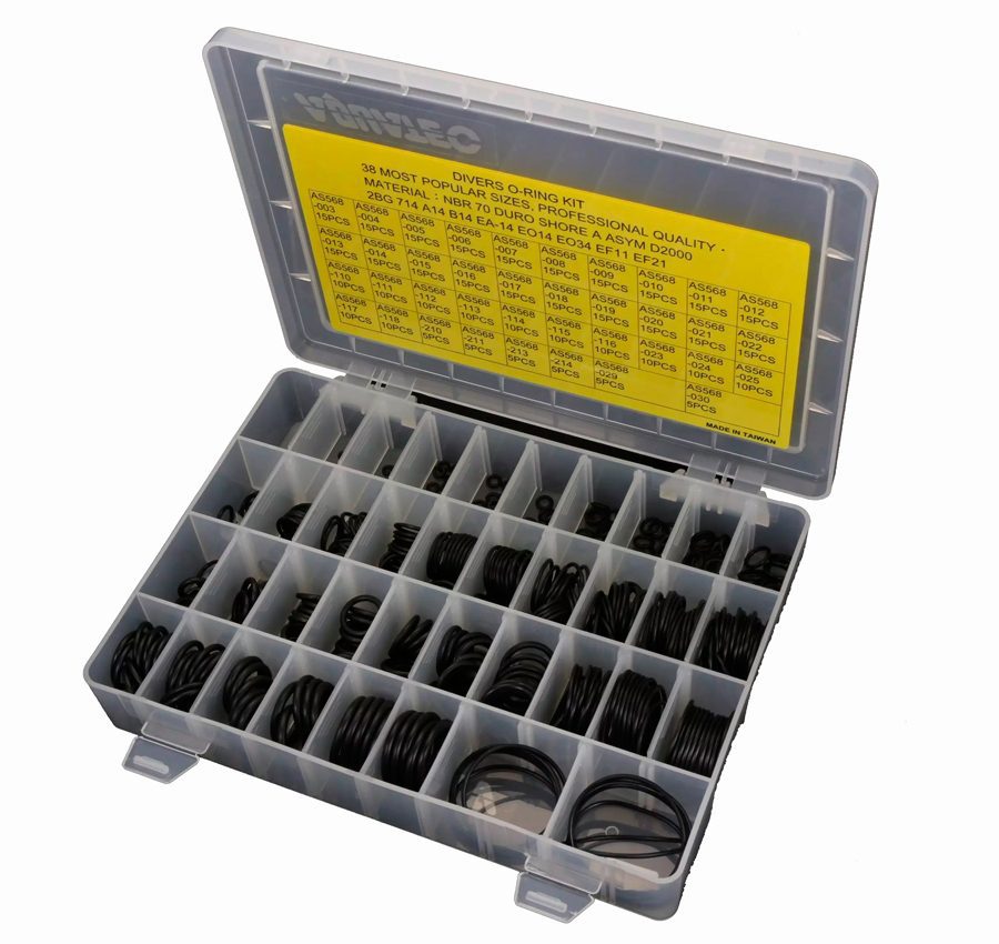 Набор о-рингов для обслуживания регуляторов и другого снаряжения для дайвинга Большой комплект (450 штук, 38 типов) уплотнительных колец. В наборе о-ринги для горловины вентиля баллонов, DIN, YOKE, для ниппеля манометра, шлангов высокого и низкого давления и многого другого. Все кольца аккуратно рассортированы по типам и упакованы в удобный пластиковый кейс.