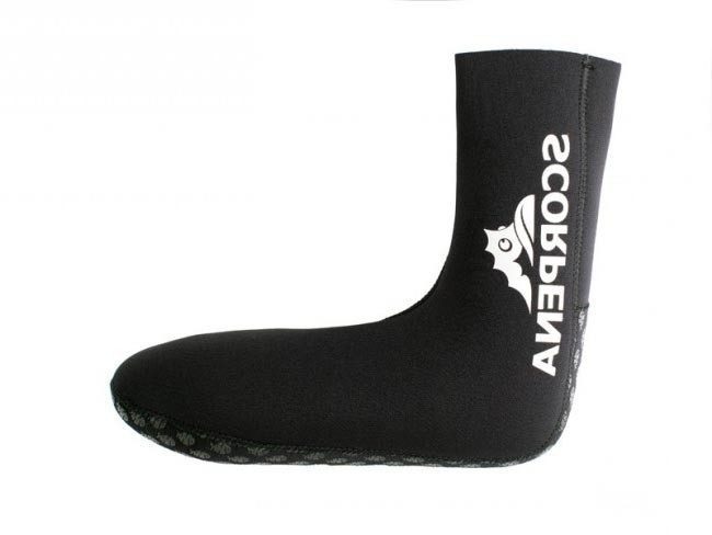 Неопреновые носки Scorpena D выполнены из 7 мм неопрена с открытой порой изнутри — для максимальной теплозащиты при длительной охоте. Швы проклеены встык и прошиты слепым швом — неопрен не пробит иголкой насквозь, а только сшивает слой наружной ткани, что исключает протекание воды по швам. Создавались они с учетом особенностей строения правой и левой ног охотника, а также учитывают угол наклона ступни при гребке. Подошвенная часть носка выполнена из более твердого неопрена для большей защиты стоп и меньшей стаптываемости при длительной ходьбе. Снаружи неопрен покрыт износостойким и прочным покрытием Supratex. Кроме того, на нее нанесено защитное антипроскальзывающее покрытие в виде лаконичного орнамента.