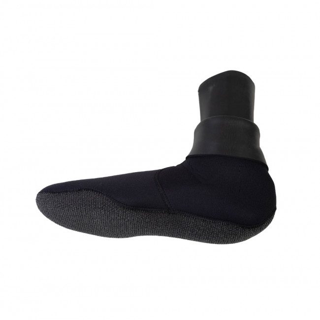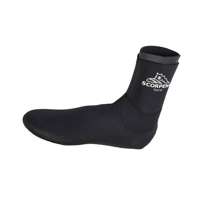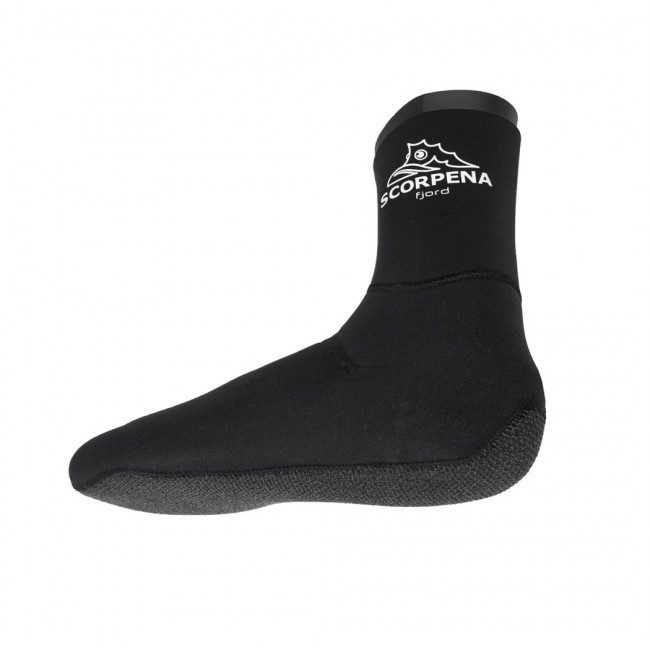 Носки «сухого» типа SCORPENA Fjord сконструированы для подводных охотников, которые не только много времени проводят под водой, но также добираются пешком по берегу до места охоты и обратно. Анатомический крой носков различается для правой и левой ноги, поэтому они лучше садятся на стопу, а форма одинаково удобна как для плавания, так и для длительных пеших переходов по пересечённой местности. Идеально подойдут для людей со средним и высоким подъёмом ноги. Носки оснащены двойном манжетой с внутренним покрытием типа smoothskin, что в сочетании с манжетами штанин охотничьего гидрокостюма практически полностью предотвращают попадание воды внутрь. Носки изготовлены из нескольких марок неопрена фирмы SHEICO, склеены в торец неопреновым клеем на водной основе, сшиты «слепым» швом (при котором игла не пробивает неопрен насквозь, а только сшивает внешнюю ткань, что препятствует проникновению воды через швы). На носках Scorpena Fjord используется тканевое покрытие трёх различных типов. Зоны, где требуется максимальная растяжимость, покрыты лайкрой. Там, где нужна большая прочность, использован нейлон. В местах наибольшего истирания применено покрытие типа кевлар. Все ткани приклеены к лицевой и изнаночной сторонам носков новейшим неопреновым клеем на водяной основе. Для подошвы носков SCORPENA Fjord использован более плотный неопрен с высокой степенью устойчивости к стаптыванию при ходьбе. Изнутри эта подошва снабжена мягким покрытием типа «плюш» — для предотвращения проскальзывания при ходьбе по наклонным участкам, а снаружи покрыта максимально стойким к истиранию материалом типа кевлар. Толщина носков — 7 мм. Размеры от 36-37 (XS) до 46-47 (XXL).