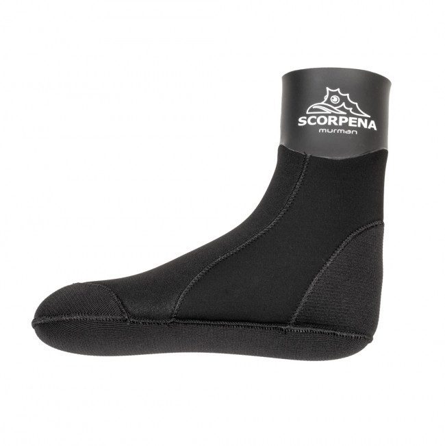 Носки «полусухого» типа SCORPENA Murman разработаны в первую очередь для подводных охотников, использующих ласты регулируемого типа (с открытой пяткой). Для дополнительной защиты от истирания калошей ласты, передняя часть носка покрыта изностойким материалом типа supratex. Этим же материалом усилена задняя часть носка, чтобы защитить его от негативного воздействия резинового или пружинного ремешка. Анатомический крой носков различается для правой и левой ног, поэтому они отлично садятся на стопу, а форма одинаково удобна как для плавания, так и для длительных пеших переходов по пересечённой местности. Эти носки оснащены манжетой с внешним покрытием типа smoothskin, поэтому при надевании поверх неё штанов охотничьего гидрокостюма с «открытой порой» или гладкой манжетой изнутри, попадание воды внутрь сокращается до минимума. Но обязательно нужно проявлять аккуратность при надевании и снимании таких носков, натягивать их следует взявшись не за манжету, а за часть покрытую тканью с обоих сторон! Носки изготовлены из нескольких марок оригинального неопрена фирмы SHEICO, склеены в торец неопреновым клеем на водной основе, сшиты «слепым швом» (при котором игла не пробивает неопрен насквозь, а только сшивает внешнюю ткань, что препятствует проникновению воды через швы). На носках SCORPENA Murman используется тканевое покрытие трёх различных типов. Зоны, где требуется максимальная растяжимость, покрыты лайкрой. Там, где нужна большая прочность использован нейлон. А в местах наибольшего истирания применено покрытие типа supratex. Все ткани приклеены к лицевой и изнаночной сторонам носков новейшим неопреновым клеем на водной основе. Для подошвы носков SCORPENA Murman использован более плотный неопрен с высокой степенью устойчивости к стаптыванию при ходьбе. Изнутри эта подошва снабжена мягким покрытием типа «плюш» для предотвращения проскальзывания при ходьбе по наклонным участкам, а снаружи покрыта максимально стойким к истиранию материалом типа supratex. Этот материал заходит спереди на мысок — до основания пальцев, а пятка защищена сзади и по бокам до ахиллова сухожилия. Толщина носков — 7 или 9 мм. Размеры от 36-37 (XS) до 46-47 (XXL).