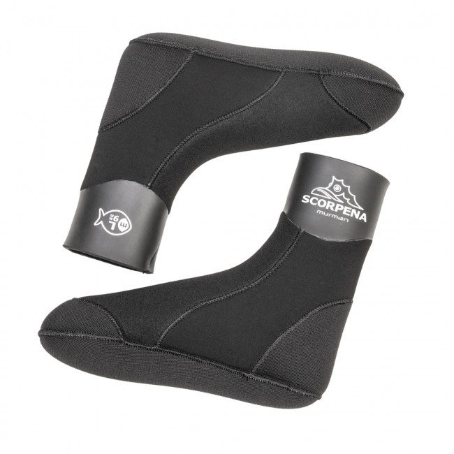 Носки «полусухого» типа SCORPENA Murman разработаны в первую очередь для подводных охотников, использующих ласты регулируемого типа (с открытой пяткой). Для дополнительной защиты от истирания калошей ласты, передняя часть носка покрыта изностойким материалом типа supratex. Этим же материалом усилена задняя часть носка, чтобы защитить его от негативного воздействия резинового или пружинного ремешка. Анатомический крой носков различается для правой и левой ног, поэтому они отлично садятся на стопу, а форма одинаково удобна как для плавания, так и для длительных пеших переходов по пересечённой местности. Эти носки оснащены манжетой с внешним покрытием типа smoothskin, поэтому при надевании поверх неё штанов охотничьего гидрокостюма с «открытой порой» или гладкой манжетой изнутри, попадание воды внутрь сокращается до минимума. Но обязательно нужно проявлять аккуратность при надевании и снимании таких носков, натягивать их следует взявшись не за манжету, а за часть покрытую тканью с обоих сторон! Носки изготовлены из нескольких марок оригинального неопрена фирмы SHEICO, склеены в торец неопреновым клеем на водной основе, сшиты «слепым швом» (при котором игла не пробивает неопрен насквозь, а только сшивает внешнюю ткань, что препятствует проникновению воды через швы). На носках SCORPENA Murman используется тканевое покрытие трёх различных типов. Зоны, где требуется максимальная растяжимость, покрыты лайкрой. Там, где нужна большая прочность использован нейлон. А в местах наибольшего истирания применено покрытие типа supratex. Все ткани приклеены к лицевой и изнаночной сторонам носков новейшим неопреновым клеем на водной основе. Для подошвы носков SCORPENA Murman использован более плотный неопрен с высокой степенью устойчивости к стаптыванию при ходьбе. Изнутри эта подошва снабжена мягким покрытием типа «плюш» для предотвращения проскальзывания при ходьбе по наклонным участкам, а снаружи покрыта максимально стойким к истиранию материалом типа supratex. Этот материал заходит спереди на мысок — до основания пальцев, а пятка защищена сзади и по бокам до ахиллова сухожилия. Толщина носков — 7 или 9 мм.  Размеры от 36-37 (XS) до 46-47 (XXL).