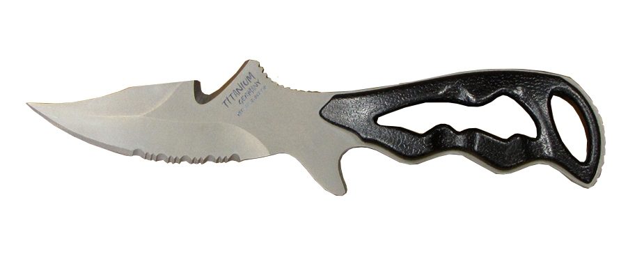 Нож для подводной охоты и дайвинга Aguatec T-Rex, компактный и легкий, оснащен серрейтором, широким лезвием, дополнительным адаптером для крепления к компенсатору плавучести. В стандартную комплектацию входят ленты для крепления на ногу, крепления к грузовому поясу или компенсатору плавучести.
