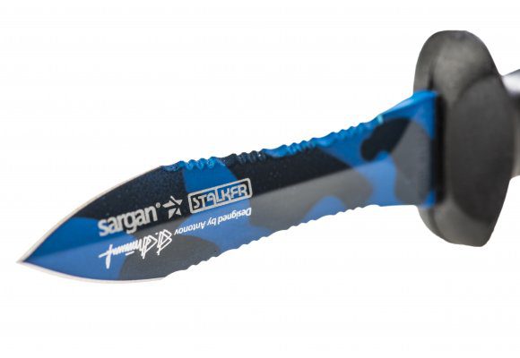 Нож подводного охотника — Тургояк Стропорез mini, с характерной формой клинка стропореза ВДВ. Этот нож является «младшим братом», бюджетным вариантом ножа «СТАЛКЕР-СТРОПОРЕЗ Z1». Удлиненная вогнутая линия реза, существенно облегчает разрезание одним движением различного рода шнуров, лесок, сетей — смертельную опасность для подводного охотника или дайвера.Копьевидное острие клинка имеет хорошую проникающую способность, что позволяет уверенно обездвиживать даже самую крупную трофейную рыбу. Рукоятка ножа изготовлена из нескользящего технополимера. На конце рукоятки имеется отверстие для эластичного шнурка.Никогда не используйте нейлоновые нерастяжимые шнуры. Самый простой вариант – резинка «от трусов» белого цвета, чтобы легче было найти нож, выпавший из руки под водой.Специальный Нож Подводного Охотника Тургояк Стропорез mini рекомендуется размещать на левой стороне груди на штатных клипсах костюмов SARGAN, что гарантирует быстрое и легкое извлечение ножа из ножен любой рукой, из любого положения, одним движением и обеспечивает мгновенную готовность к применению. Длина лезвия: 9 смТип лезвия: стропорезПокрытие лезвия: синий камуфляжРукоять: нескользящий технополимерНожны: технополимерФиксация в ножнах: резиновое кольцо