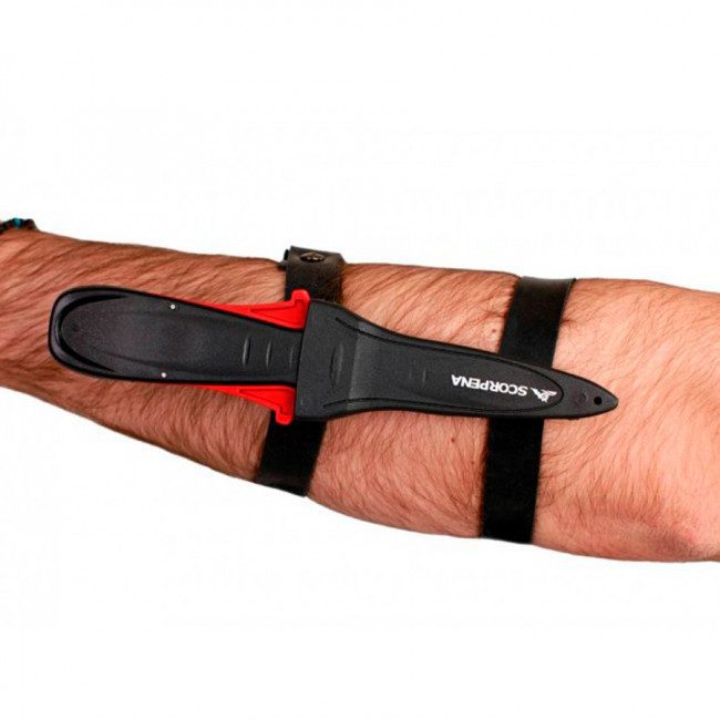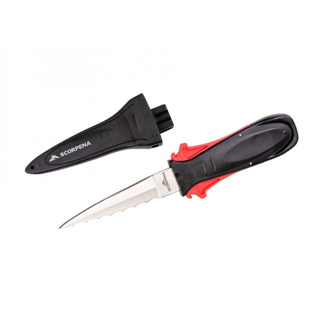 Верный помощник в любых условиях подводной охоты – универсальный и компактный нож Scorpena A2  – может использоваться в качестве как основного, так и резервного. Просто протяни руку и одним движением освободи его из ножен. Стань стремительным. Стань победителем.  • Лезвие имеет две режущие кромки – прямую и серрейторную. Новая форма и увеличенная длина серрейторной заточки позволяет не пилить встреченные вами под водой верёвки, лески и сети, а перерезать их существенно легче чем лезвием с пилообразной заточкой;• эргономичная рукоятка, выполненная из пластика, ложится в руке максимально удобно благодаря специальной форме и оптимальной толщине;• риск потери ножа минимален – он надежно крепится в ножнах благодаря механизму-защелке и вместе с тем легко достается из них после сжатия рукоятки;• лезвие ножа светлого цвета — его легко можно найти в траве или на дне если вы отложили его в сторону или случайно выронили. Но когда нож убран в ножны, то темная ручка и чёрные ножны не демаскируют подводного охотника;• в механизме ножен не содержится металлических деталей, благодаря чему нож долгое время остается в первозданном состоянии даже при использовании в морской воде;• крепление ножа возможно в любом удобном месте при помощи резиновых ремней, входящих в стандартную комплектацию – на предплечье, на грузовом поясе, на ноге, на разгрузочном жилете и т.д.;• лезвие выполнено из стали AISI 304, с высокой устойчивостью к коррозии и механическим повреждениям;• общая длина ножа – 19 см, длина лезвия – 8,9 см, ширина лезвия у основания — 1,8 см;• длина резиновых ремешков — 45 см;• вес ножа – 45 граммов.