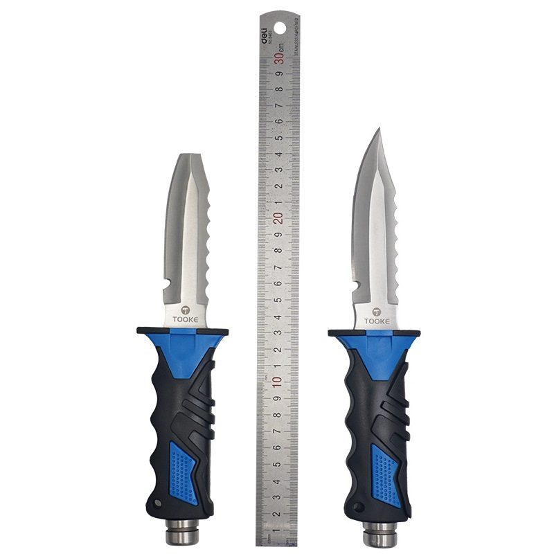 Нож водолазный, лезвие с тупым концомНож из нержавеющей стали, лезвие острое и обладает высокой твердостью. Оно специально разработано для экстренной перерезки различных канатов, веревок, линей и операций по выдергиванию/ распиливанию/ резке.Рукоятка ножа изготовлена из высококачественной резины и пластика вторичного литья под давлением, который обладает определенной гибкостью и удобен на ощупь. Рукоятка оснащена стальным молотком, который можно использовать для ударных операций Общая длина 25,5 см острый конец / 23,5 см тупой конецЛезвие:12,7 см острый конец / 10,7 см тупой конецРукоятка13 смШирина 3 см в самом широком местеТолщина 4 ммМатериал нержавеющая сталь 420Твердость 52HRCМатериал ручка — пластик+резинаМатериал ножны — пастиковое цельное литье