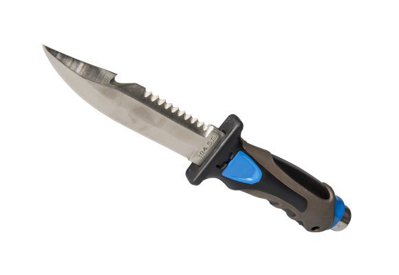 Красивый тяжелый нож с саблевидным лезвием и заточкой с двух сторон. с одной обычная заточка, со стороны обуха серрейтор и стропорез. Рукоять сделана из яркого нескользящего пластика. При желании лезвие ножа можно заменить.Полная длина ножа 25 см, длина лезвия 12 см. Лезвие состоит из режущей кромки, серейтера и стропореза.Изготовлено из нержавеющей стали.На конце рукоятки расположен стальной молоток.Рукоятка изготовлена из полипропилена с пластиковыми вставками, внешнее покрытие — терморезина.Выпускается трёх цветов: чёрный, синий, жёлтый. Комплектуется следующими аксессуарами: пластиковые ножны с замком, два резиновых ремня с пряжками. Подводный нож – это инструмент, а не оружие. Практически нож под водой используется для измерения, разрезания сетей (в том маловероятном случае, если Вы в них запутались, а в основном, чтобы насолить браконьерам), использования в качестве рычага или чтобы привлечь внимание к себе, постучав им по баллону. А поскольку звук в воде распространяется в 4 раза быстрее, чем на поверхности, будьте уверены, Вас услышат. Ну и самое главное его предназначение – это получение эстетического наслаждения от красивого, но вполне мирного оружия.