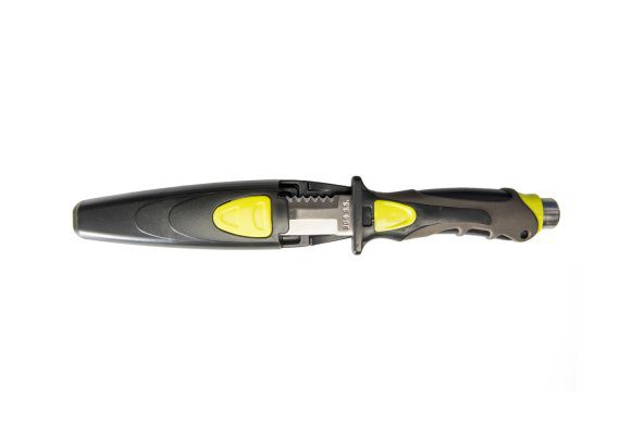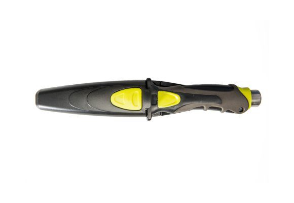Красивый тяжелый нож с саблевидным лезвием и заточкой с двух сторон. с одной обычная заточка, со стороны обуха серрейтор и стропорез. Рукоять сделана из яркого нескользящего пластика. При желании лезвие ножа можно заменить.Полная длина ножа 25 см, длина лезвия 12 см. Лезвие состоит из режущей кромки, серейтера и стропореза.Изготовлено из нержавеющей стали.На конце рукоятки расположен стальной молоток.Рукоятка изготовлена из полипропилена с пластиковыми вставками, внешнее покрытие — терморезина.Выпускается трёх цветов: чёрный, синий, жёлтый. Комплектуется следующими аксессуарами: пластиковые ножны с замком, два резиновых ремня с пряжками. Подводный нож – это инструмент, а не оружие. Практически нож под водой используется для измерения, разрезания сетей (в том маловероятном случае, если Вы в них запутались, а в основном, чтобы насолить браконьерам), использования в качестве рычага или чтобы привлечь внимание к себе, постучав им по баллону. А поскольку звук в воде распространяется в 4 раза быстрее, чем на поверхности, будьте уверены, Вас услышат. Ну и самое главное его предназначение – это получение эстетического наслаждения от красивого, но вполне мирного оружия.